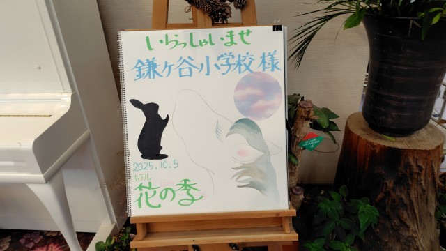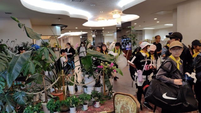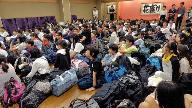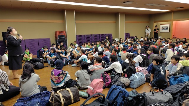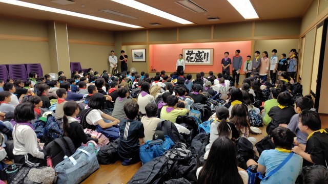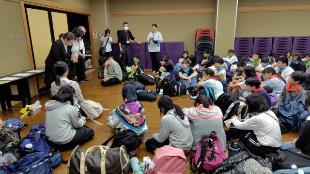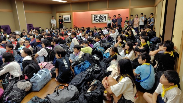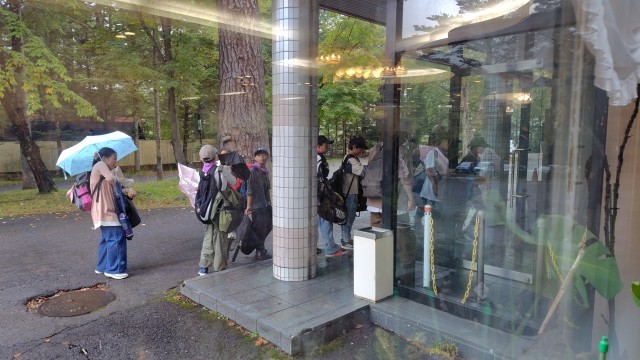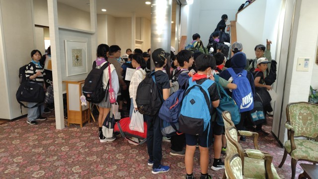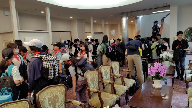 ホテルに到着しました。雨が降ってきました。到着式は室内で行いました。