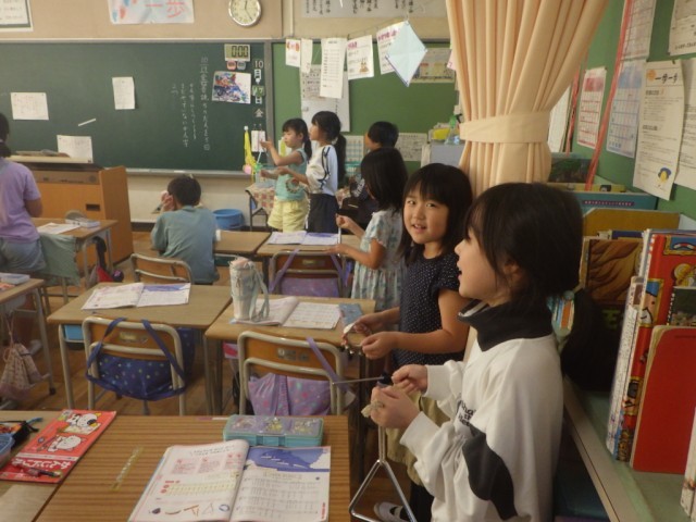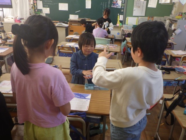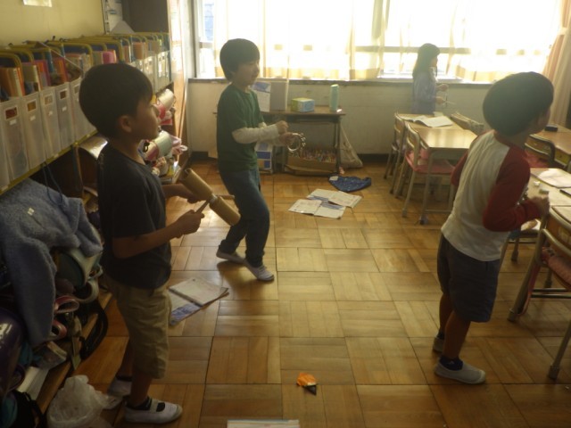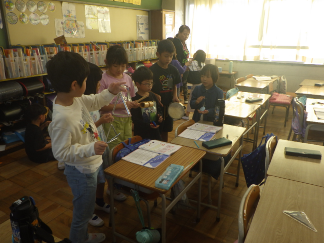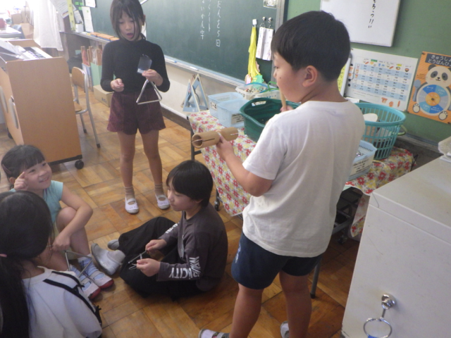 「3拍子の拍にのって、リズムをうちましょう」の学習です。さまざまな楽器を使って、リズムに乗って楽しく奏でました。※17日の様子です。