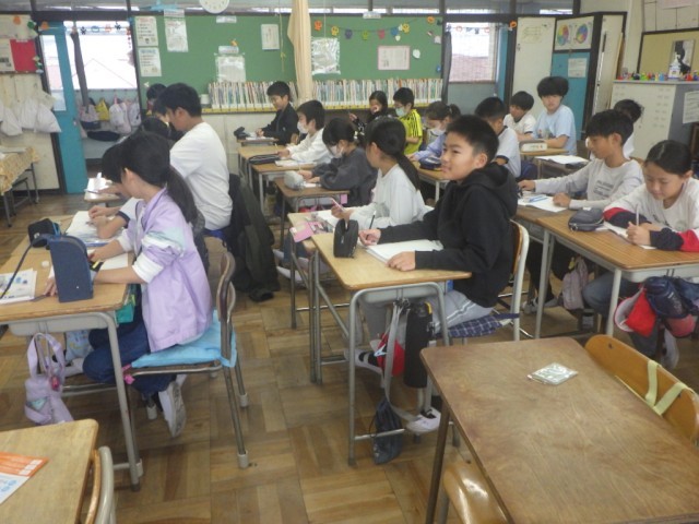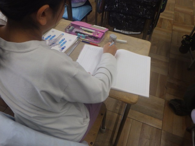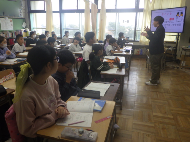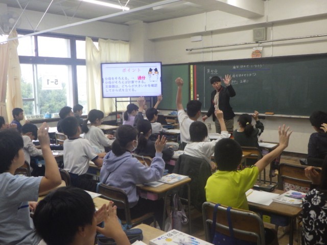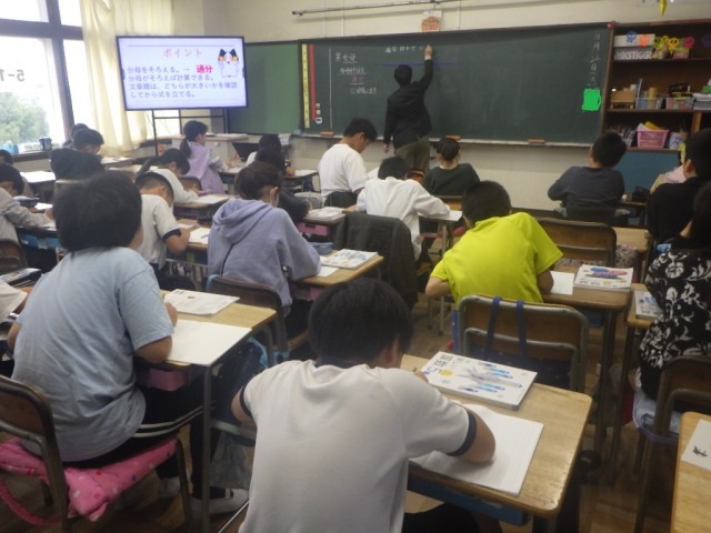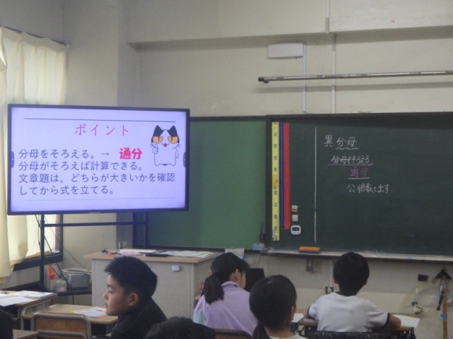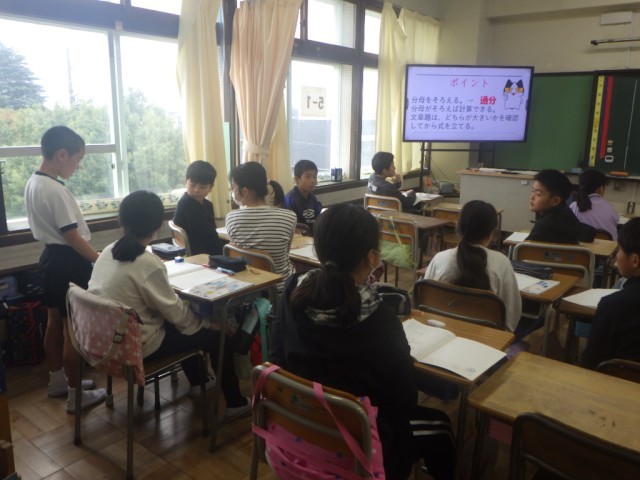 「分数のたしざん、ひき算」の様子です。通分について学習しました。「通分博士になろう!」とし、通分博士とはどういう事ができるようになることか話し合いました。