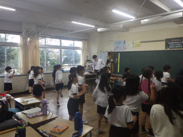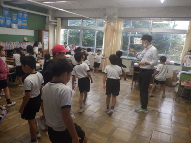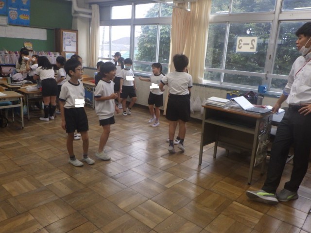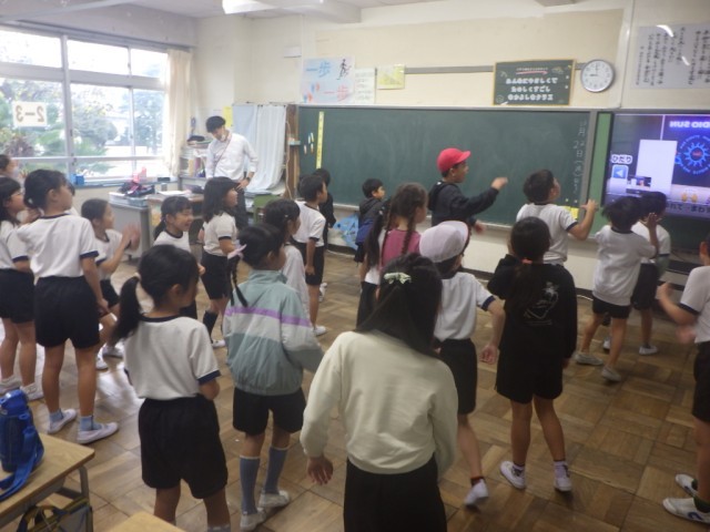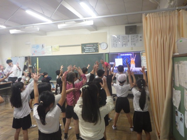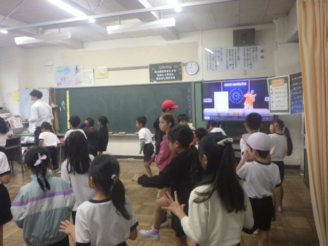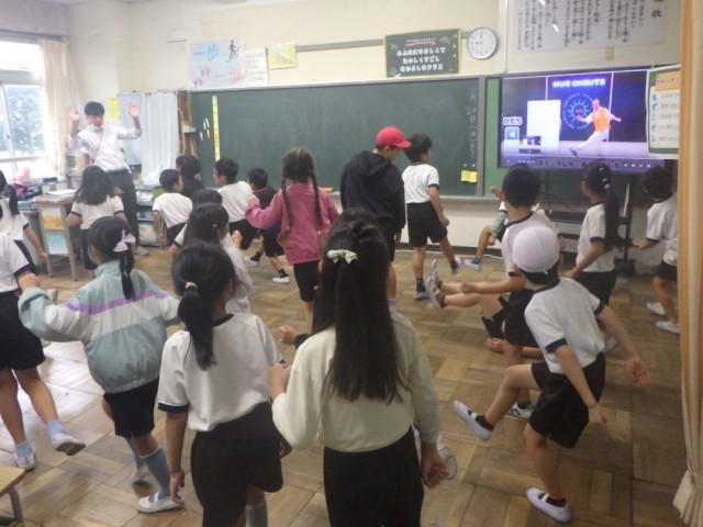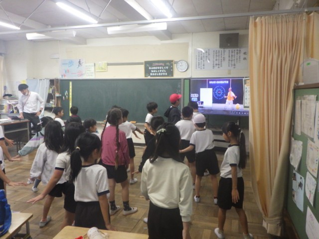 教室で、表現運動、ダンスのふりを確認していました。大型提示装置を見ながら、実際に体を動かしました。
