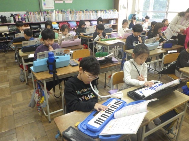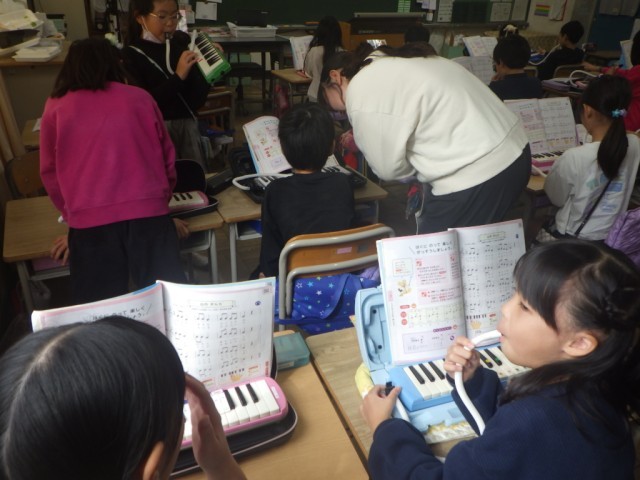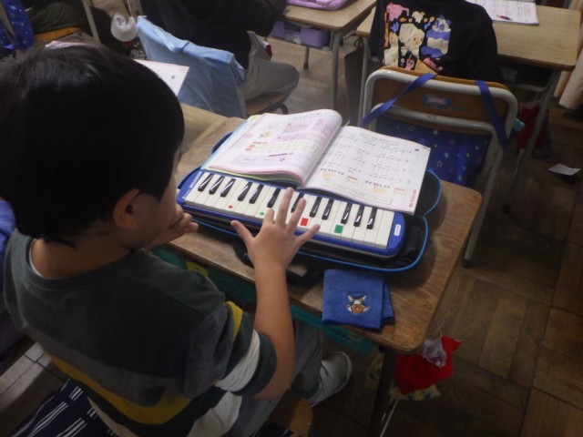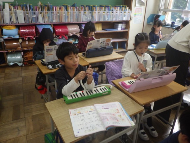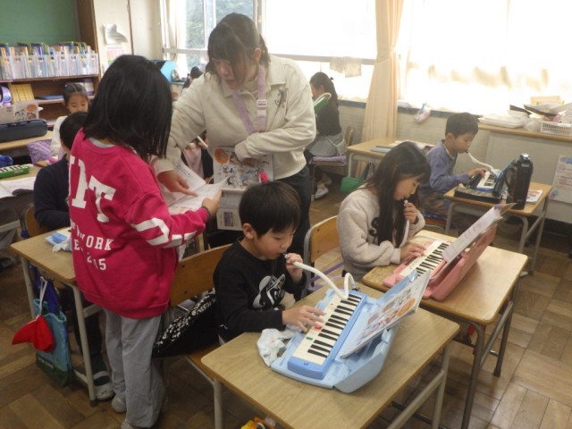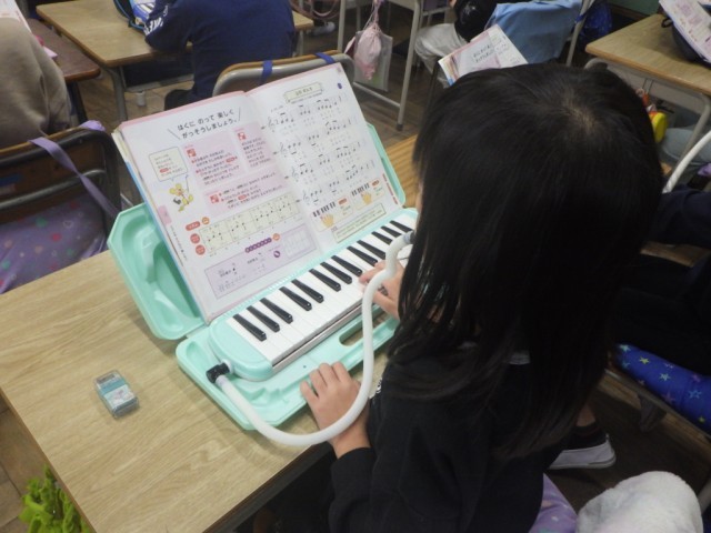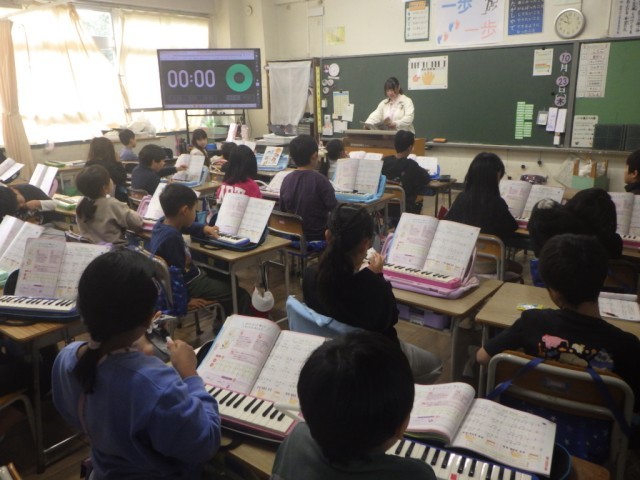「拍にのって楽しく合奏しましょう」の様子です。鍵盤ハーモニカを使って、指づかいに気をつけながら演奏を楽しみました。