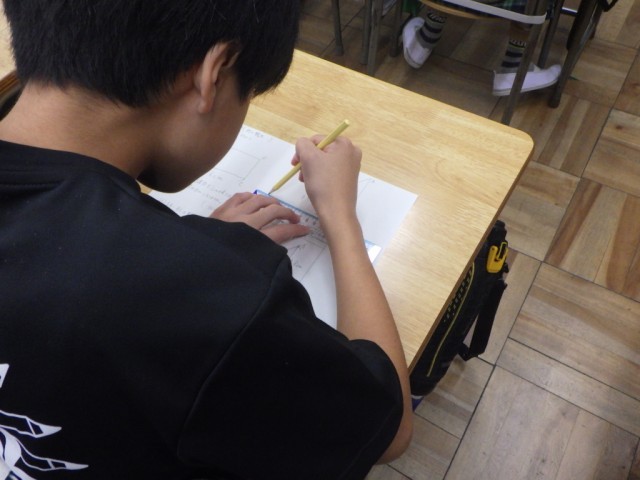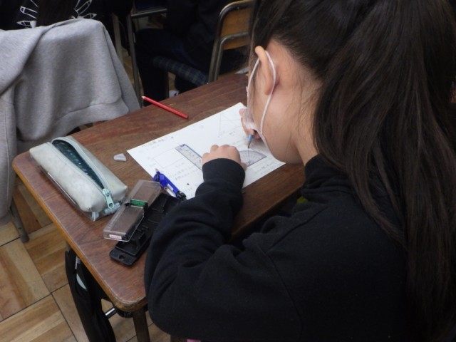 「拡大図と縮図」の様子です。図形を縮小した時を、実際に作図し、縮図を使って長さがどうなったか調べました。