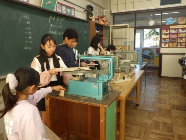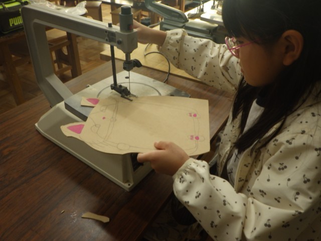 「糸のこ寄り道散歩」(使える伝言板づくり)の様子です。糸鋸を使って、ホワイトボードづくりに臨んでいます。※30日の様子です。