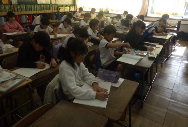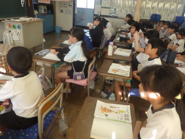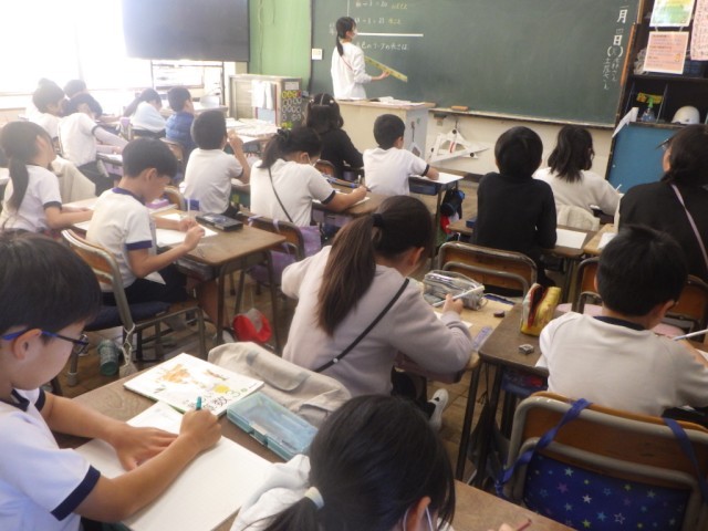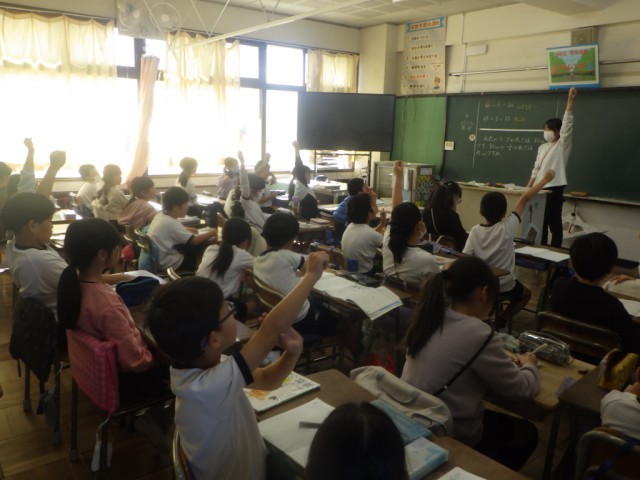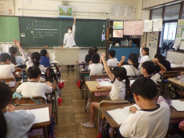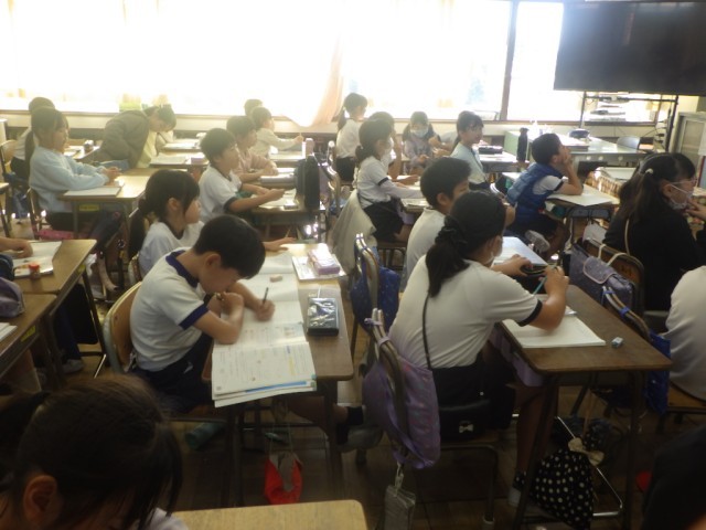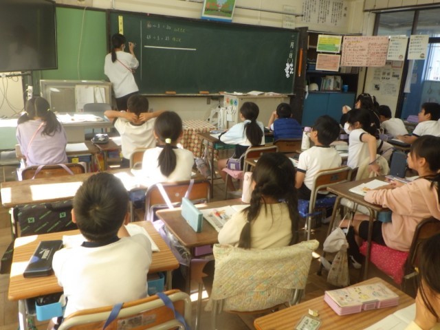 「分数とわり算」の様子です。「赤色のテープ80cmの1/4の長さは何cmですか」今までは4つに分けるとでしたが、分数になったら・・・?