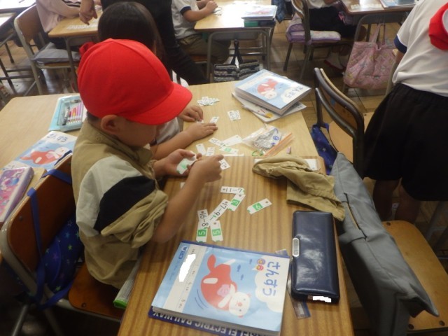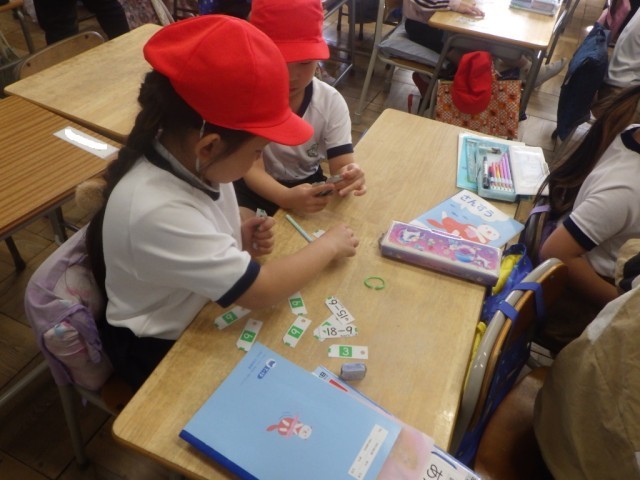 「ひき算」の様子です。「学習カードを使って、ひき算を復習しよう」です。友だちと一緒に振り返っていました。