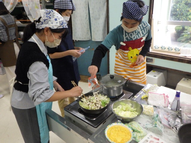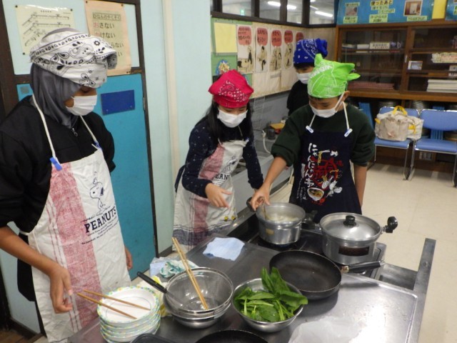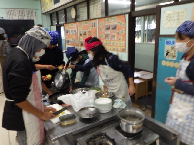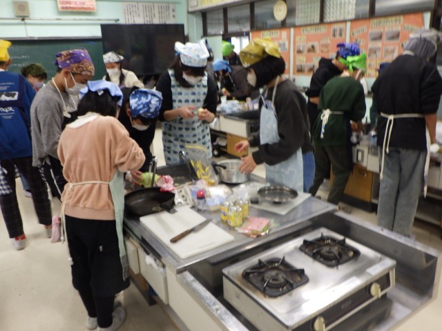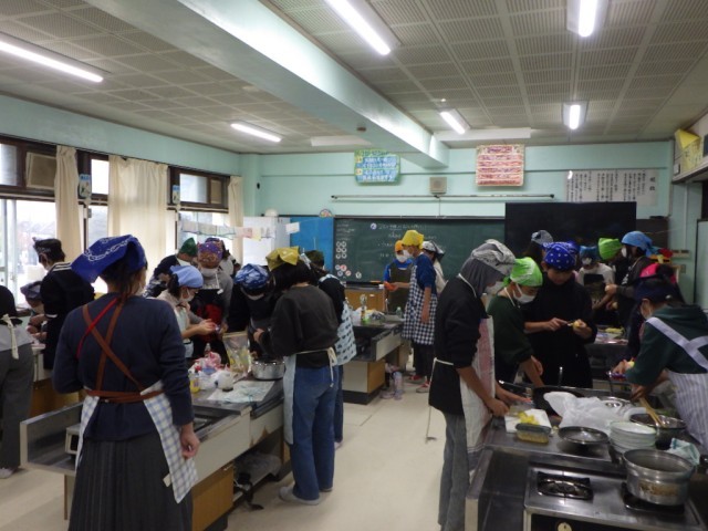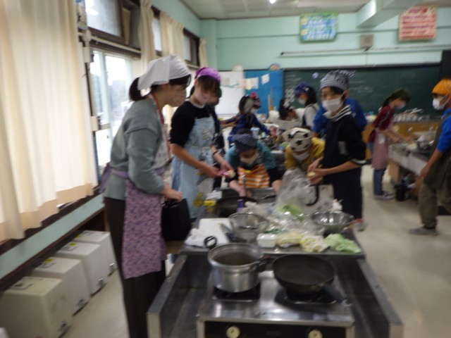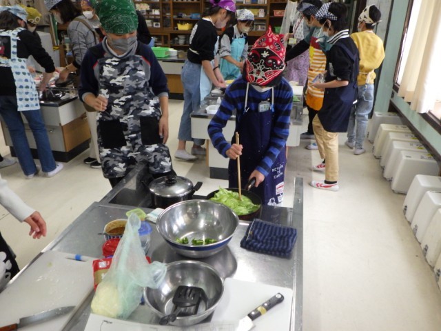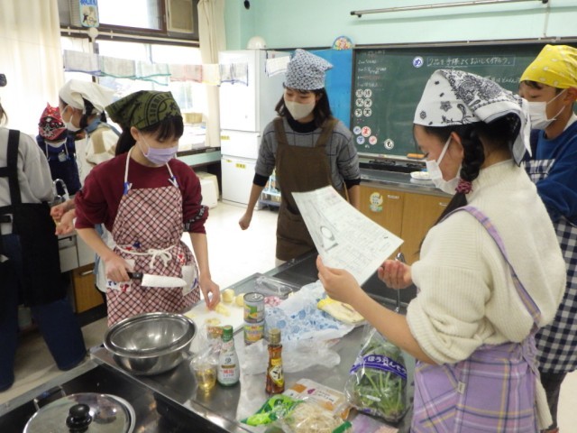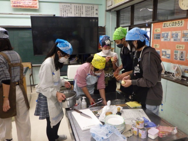 「献立を工夫して」の様子です。2品を同時進行で、手際よく美味しく作ることを目標に調子実習に臨みました。学習ボランティアの保護者の協力も、子どもたちの学習への大きな力となりました。