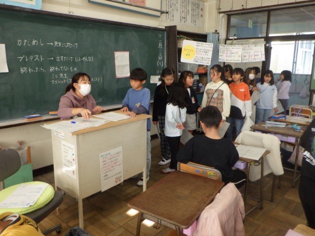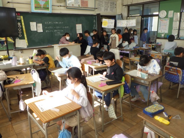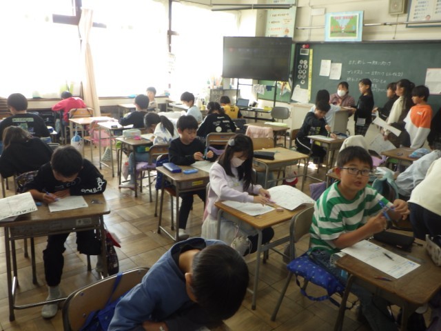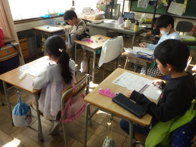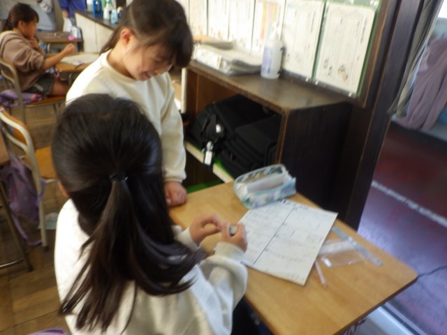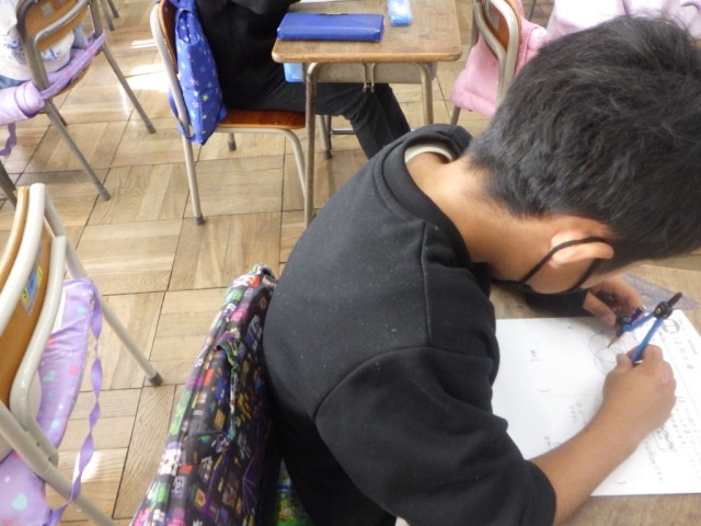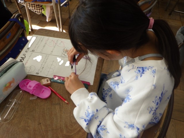 「円と球」の様子です。復習「力だめし」のプリントに挑戦しています。