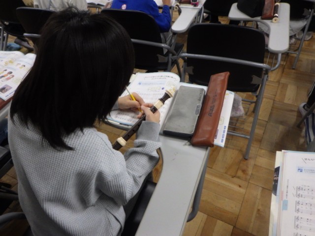 「旋律が重なり合う美しさを感じとって演奏しよう」の様子です。曲「オーラリー」をリコーダーで演奏しています。