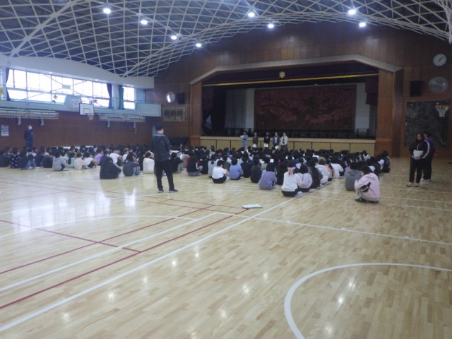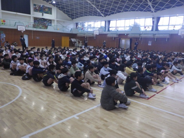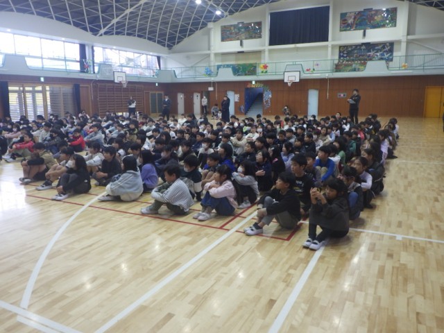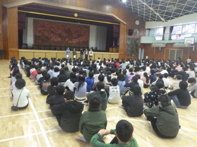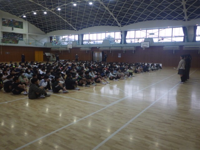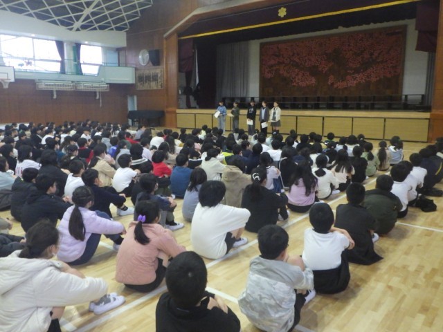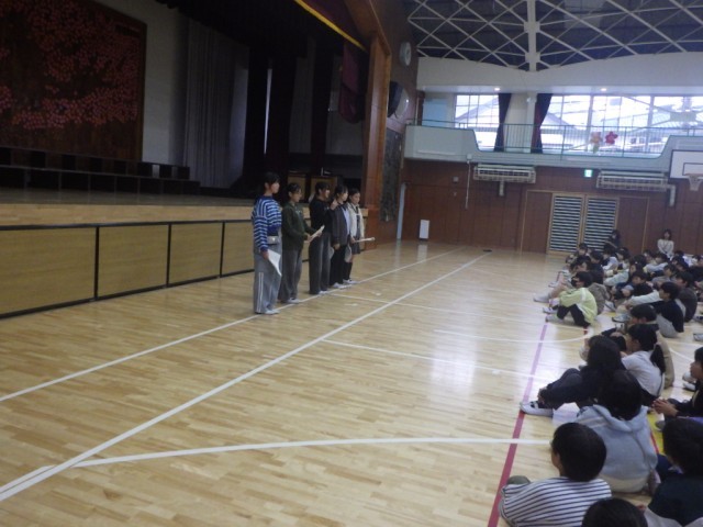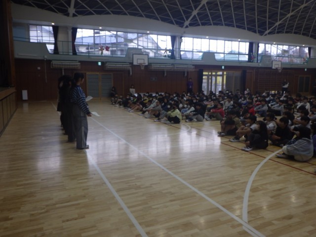 昼休み、4年生と5年生が体育館に集まりました。来年度の児童会役員を選出する時期が近づいてきました。その前に、今年度の児童会役員より児童会についての説明が行われました。