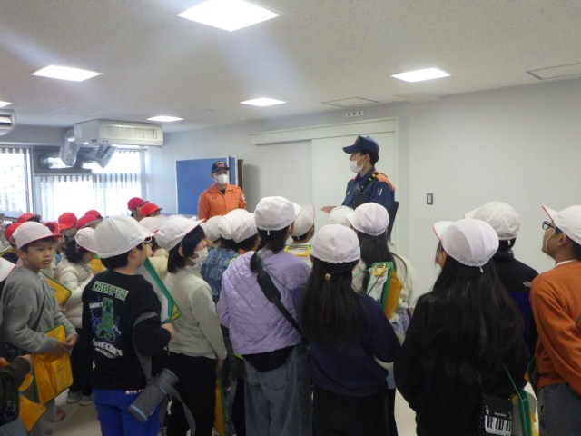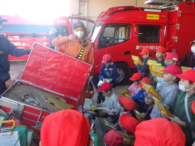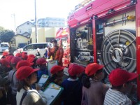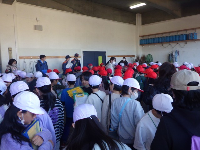 それぞれの車の装備について詳しく説明して下さいました。資機材搬送車の装備についても驚くことばかりでした。続いて、消防署内の見学をしました。食堂、仮眠室など普段見られない施設も見学しました。