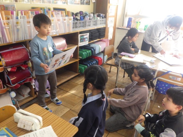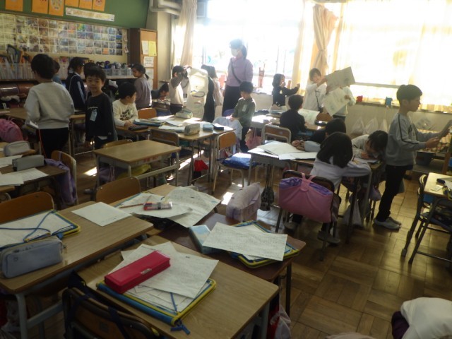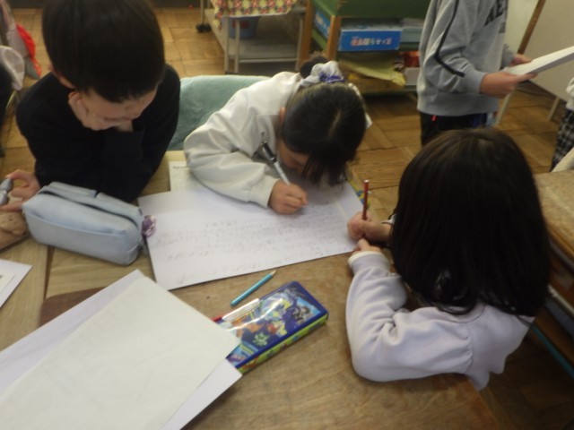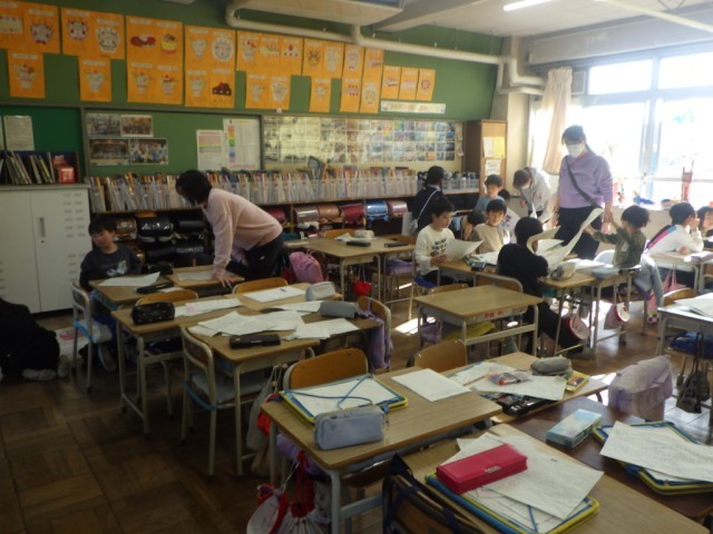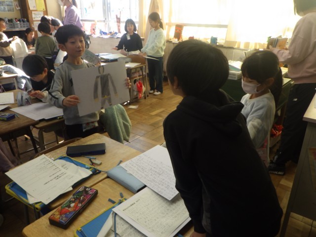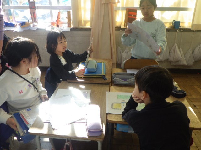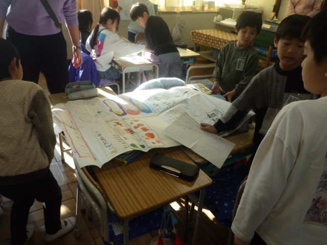 「町のキラリを見つけよう(町探検)」で、市内の施設を探検した時の内容を模造紙になどにまとめて発表します。その準備の様子です。