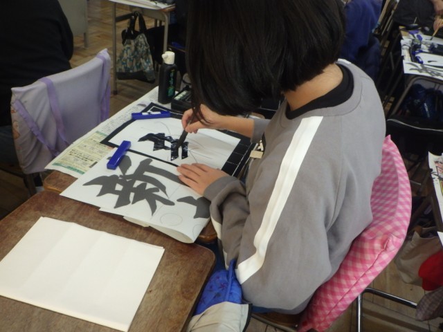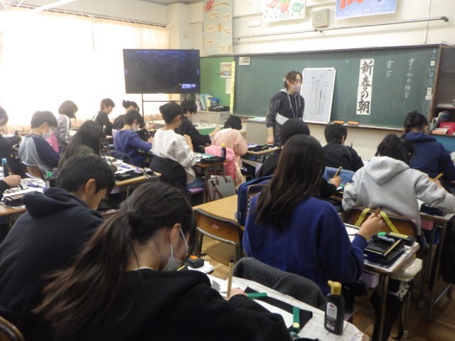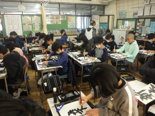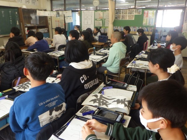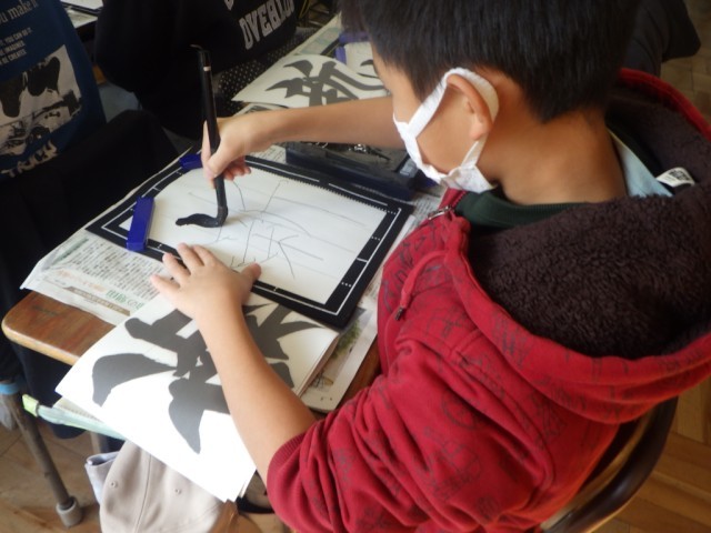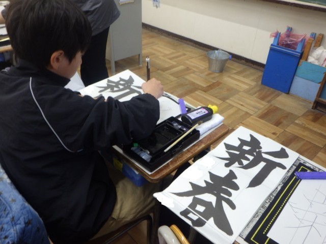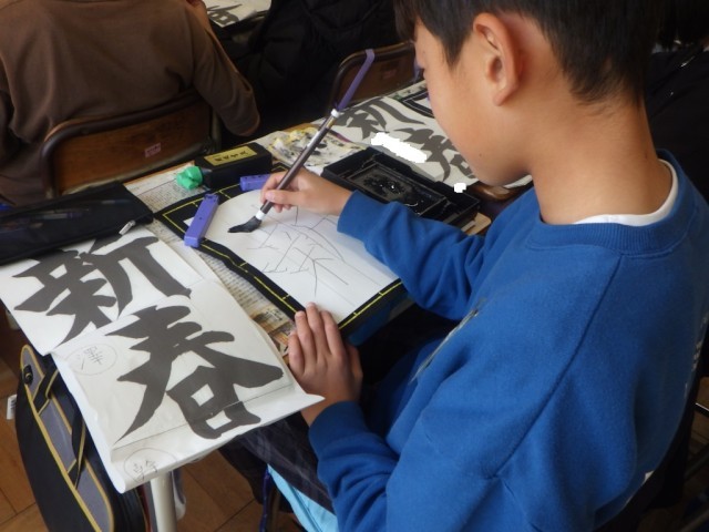 「書き初め」の様子です。いよいよこの季節となりました。普段とは違うだるま筆を使う子もいます。