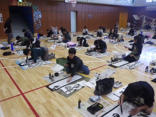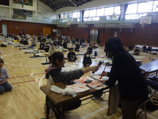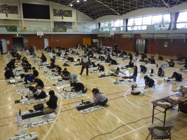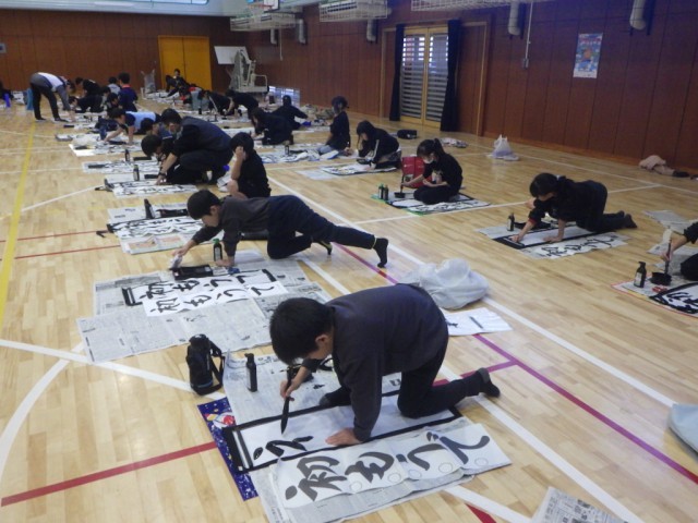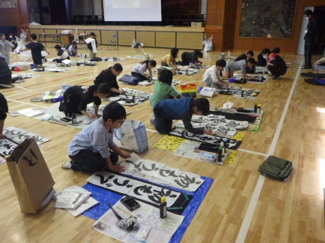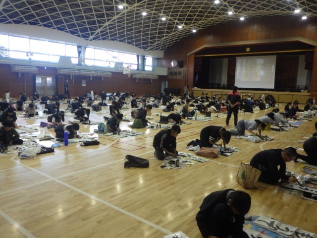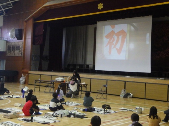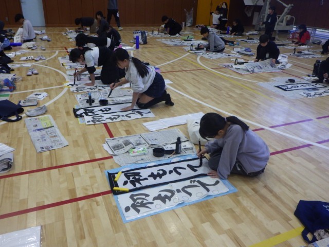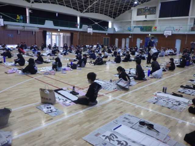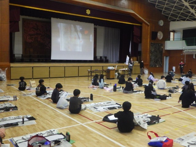3・4時間目、体育館で4年生が、お招きした講師の先生より指導を受け、書き初め練習に臨みました。その様子です。