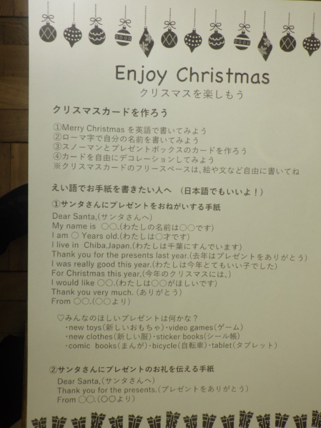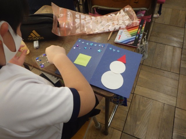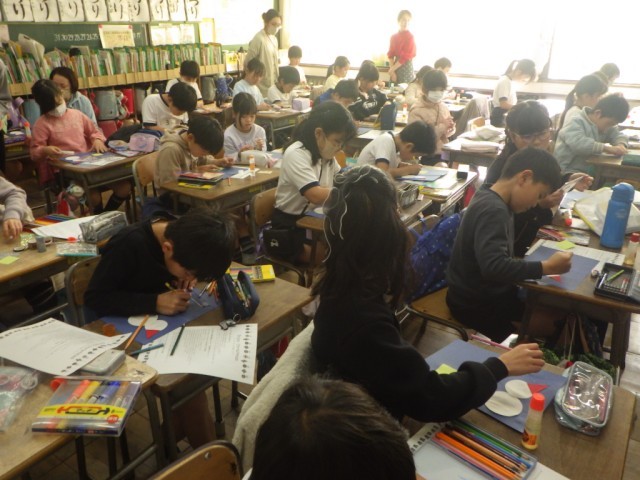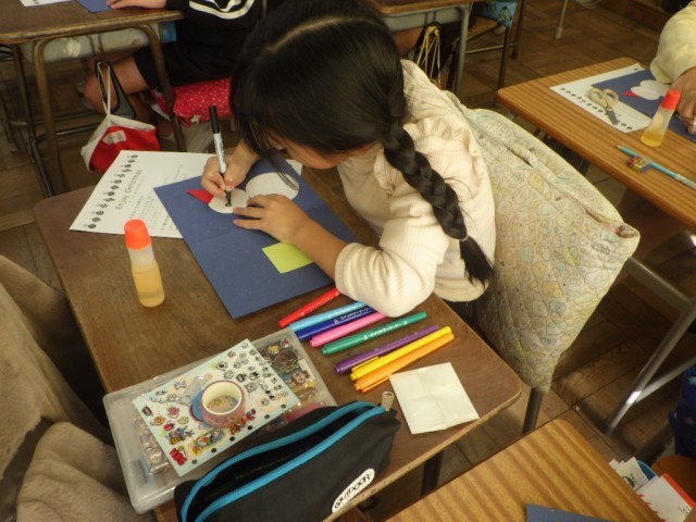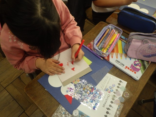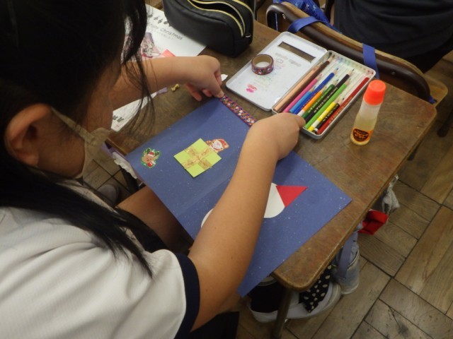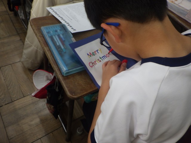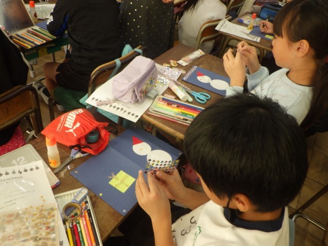 今日明日と3年生の各学級で「学年PTA活動」が行われます。「Enjoy Christmas (クリスマスを楽しもう)」をテーマに、クリスマスカードを作ります。保護者の方々からの素敵なひとときの贈り物に子どもたちは笑顔にあふれていました。