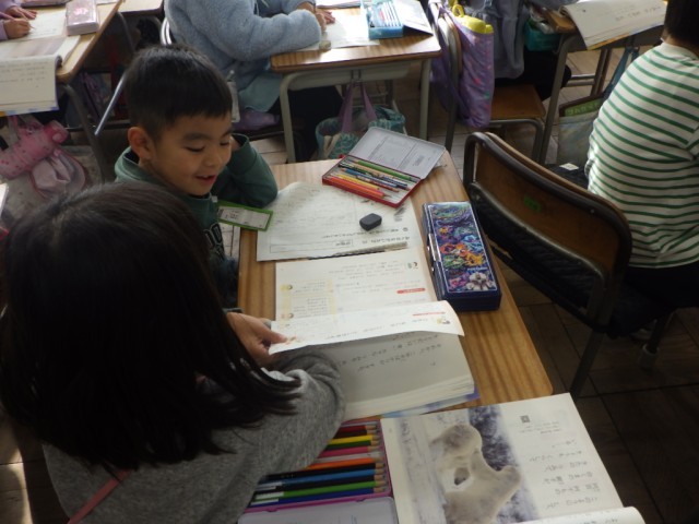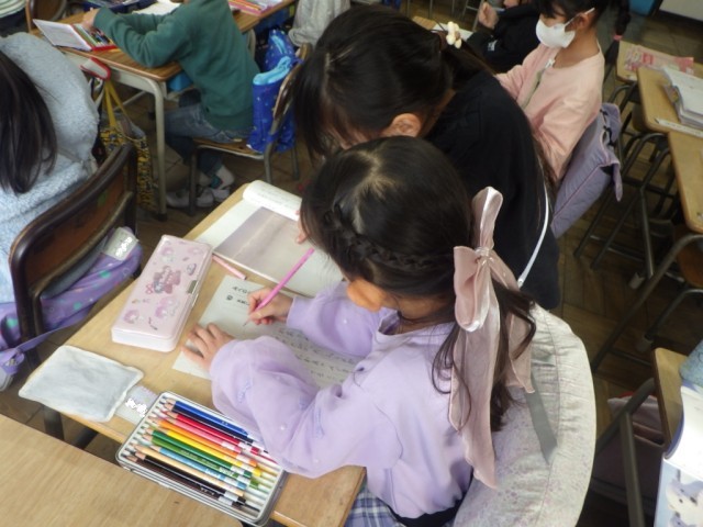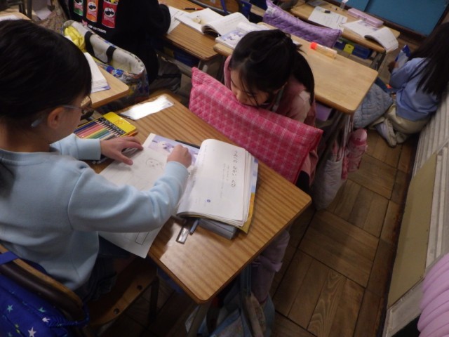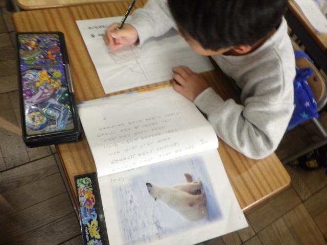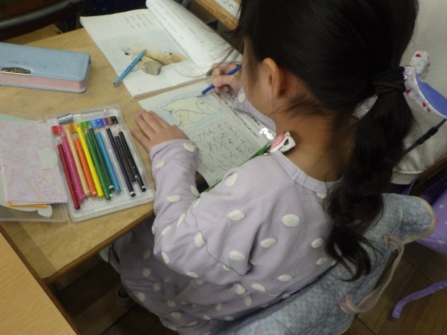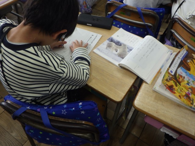「うみへのながいみち」の様子です。お気に入りの写真を紹介するため、ワークシートに絵と文を書きまとめました。※16日の様子です。