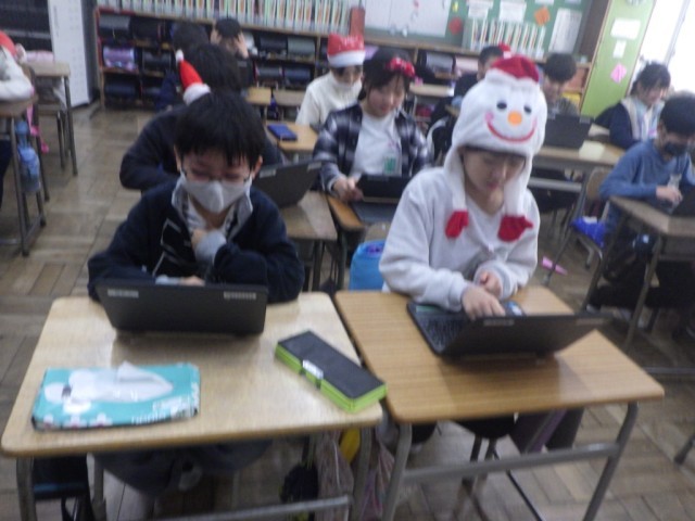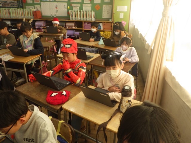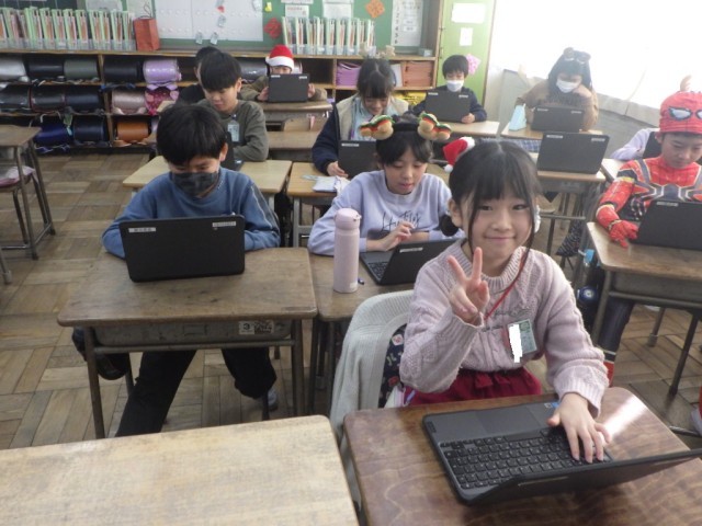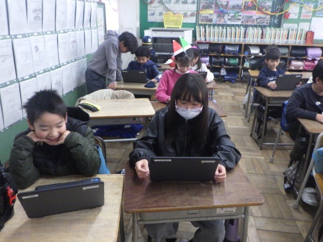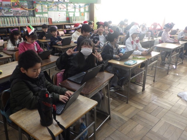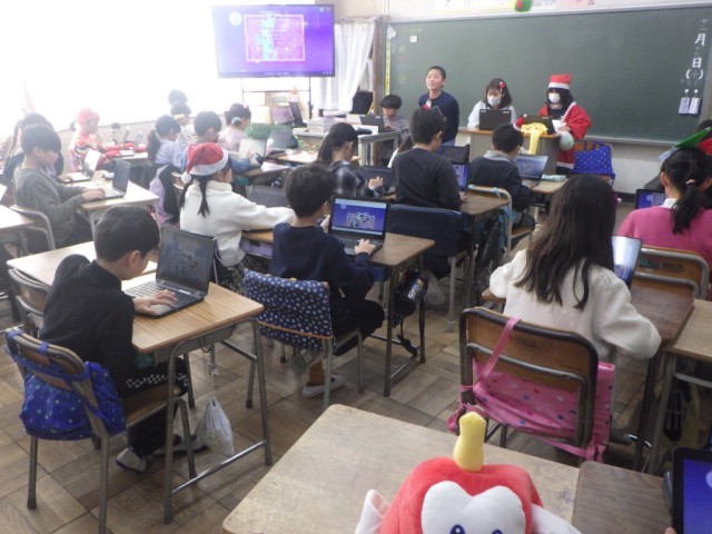 学習端末機を使って、クリスマスにちなんだ学級レクを行っている様子です。普段とは違った姿が見られます。※19日の様子です。