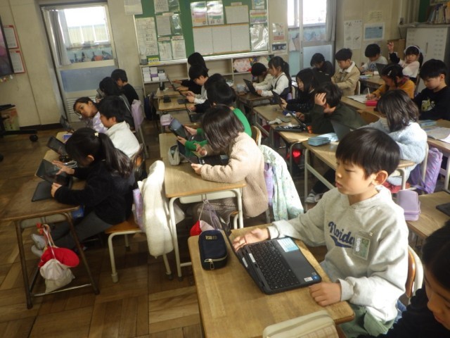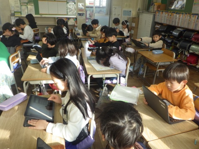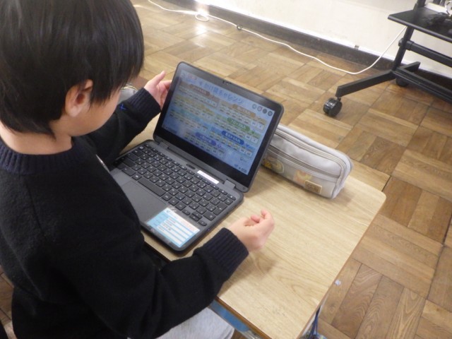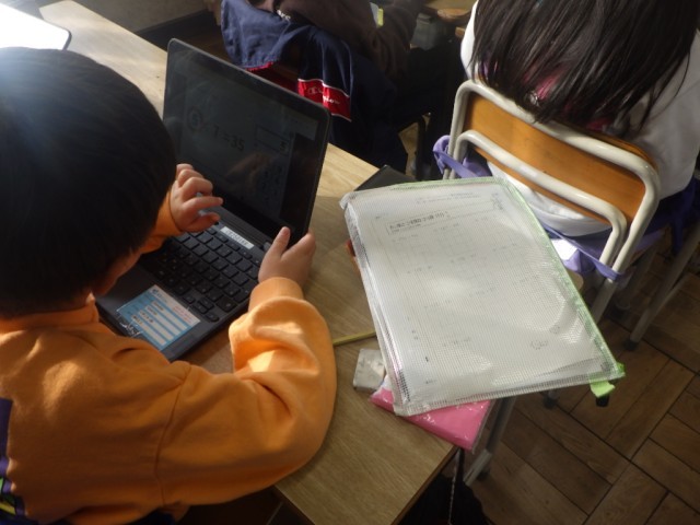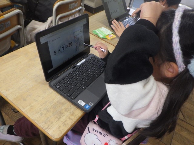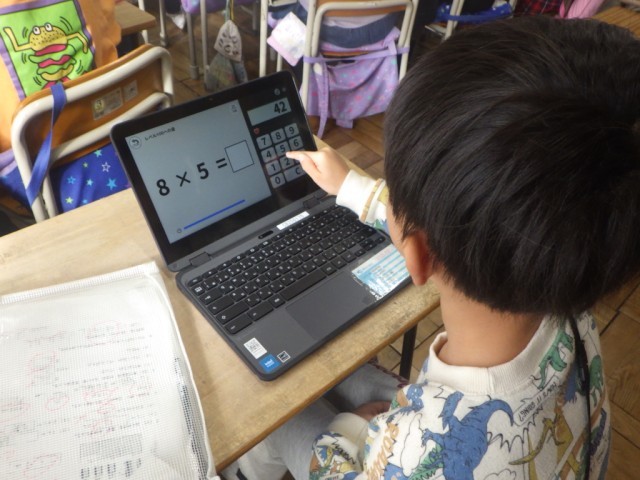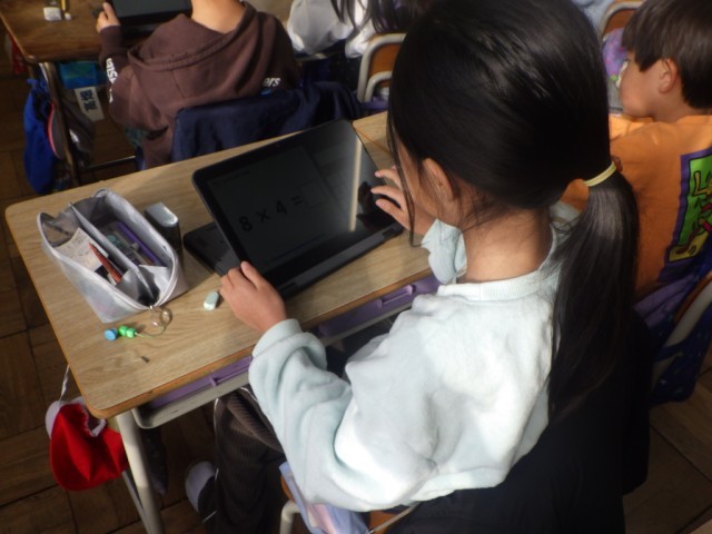 学習端末機のアプリを使って、かけ算の復習を行っている様子です。自分のペースで、自分なりに進めることができます。※19日の様子です。