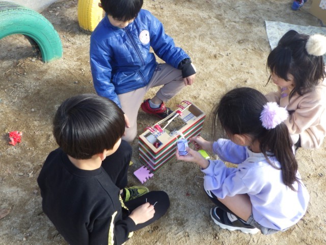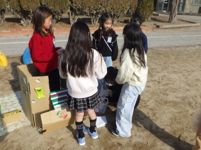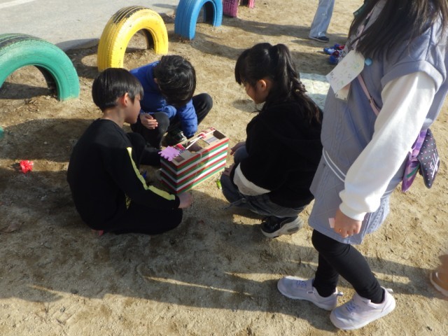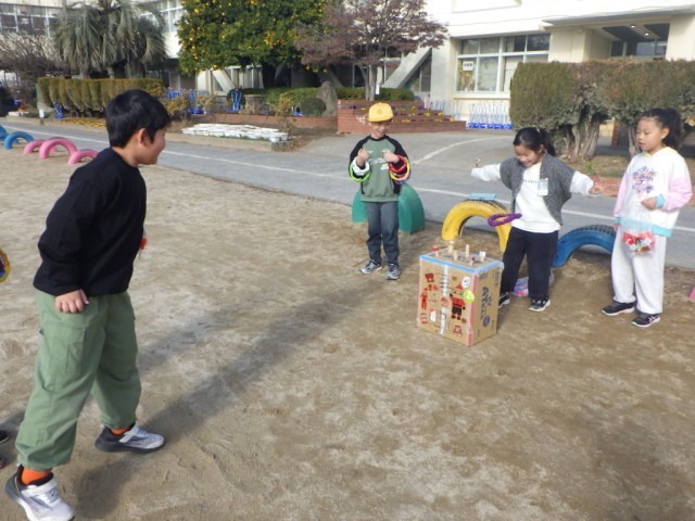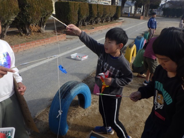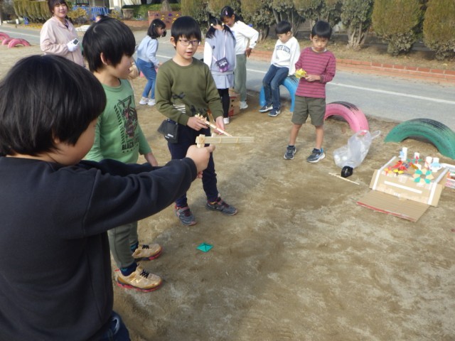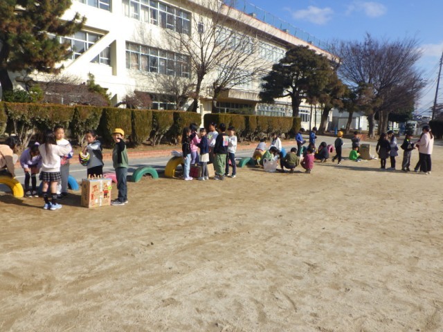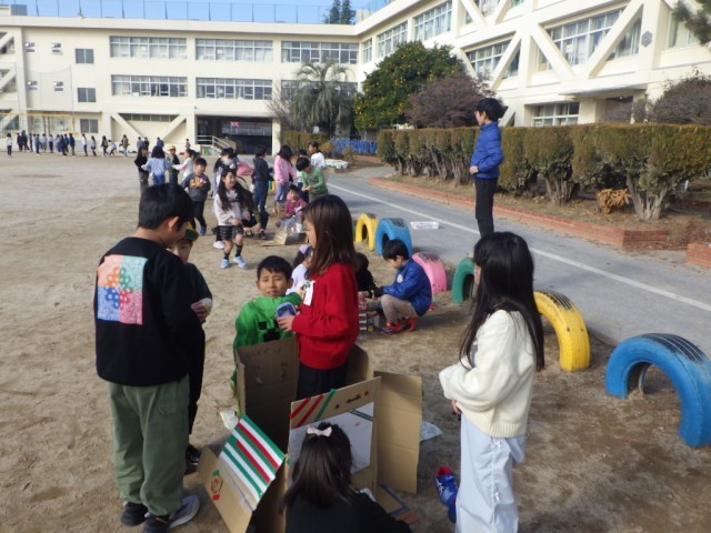 校庭では、「冬祭り」が行われていました。子どもが工夫したお店が並び、楽しいひとときを過ごしていました。