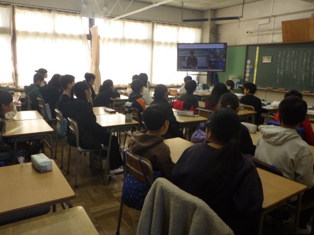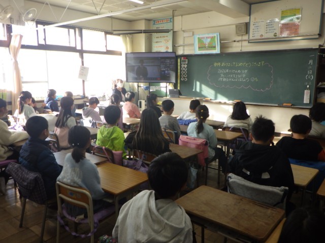 オンラインによる始業式の様子です。開式の言葉、校歌斉唱、校長先生の話、安全指導主任の先生からの話、閉式の言葉。各教室の様子です。3学期が始まりました。今学期もよろしくお願いします。