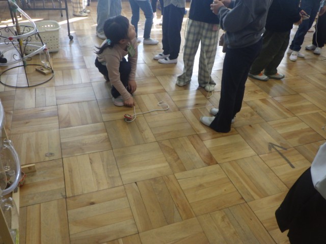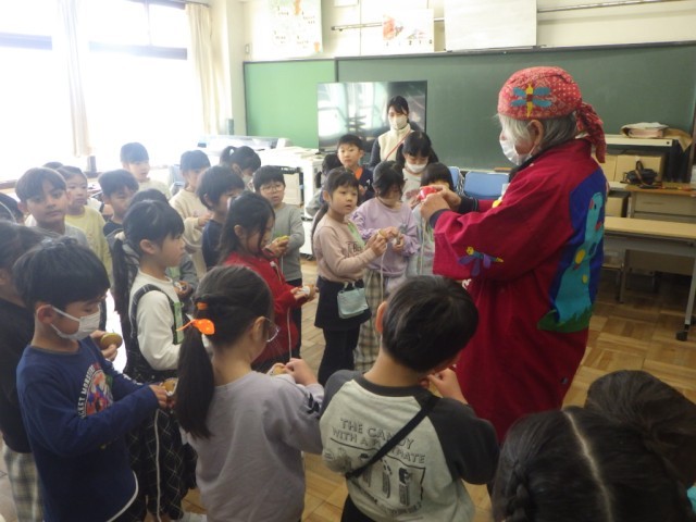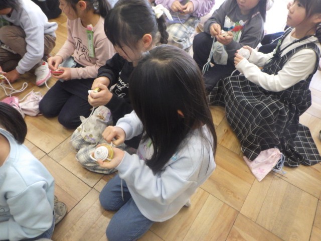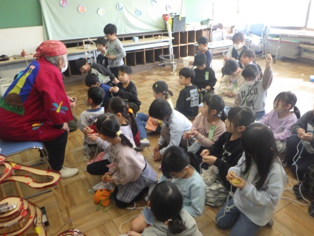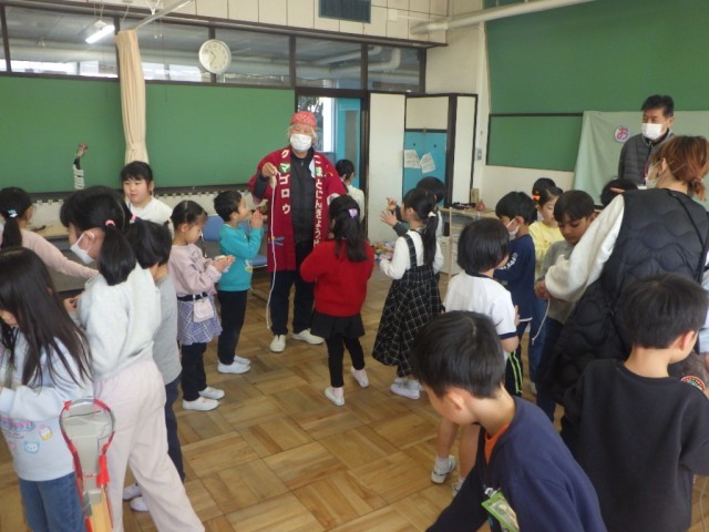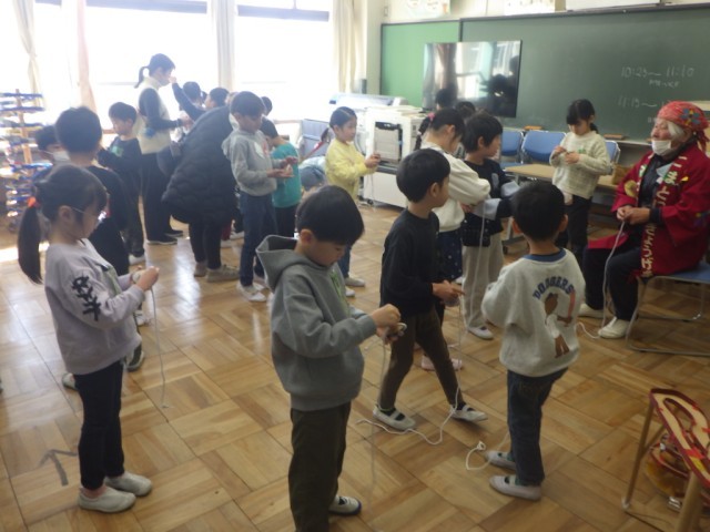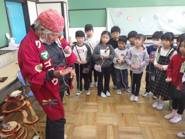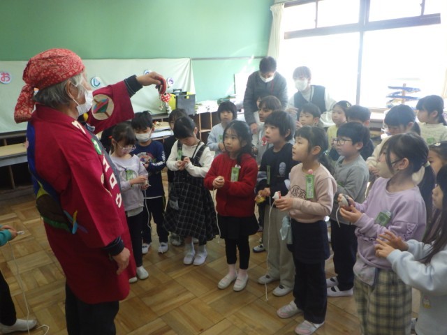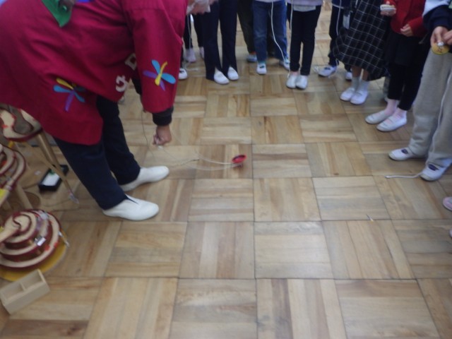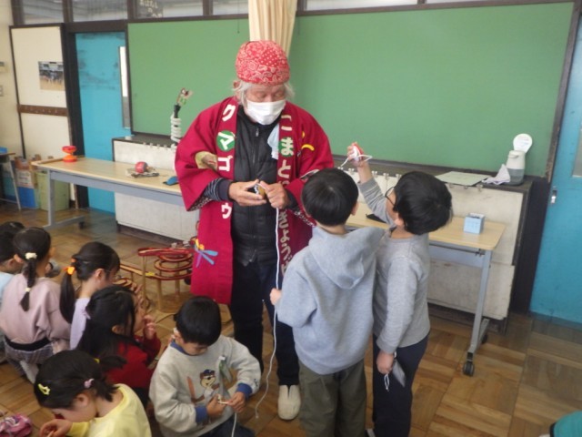1年生のもとに、こまの回し方について、教えて下さる先生が来て下さいました。こまへの糸の巻き方やいざ回すときのコツなど、丁寧に教えていただきました。今日と明日で1年生の全学級の子どもたちに教えていただきます。