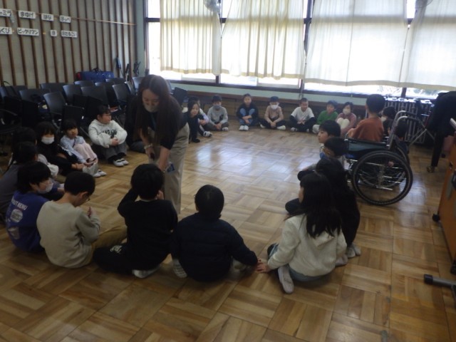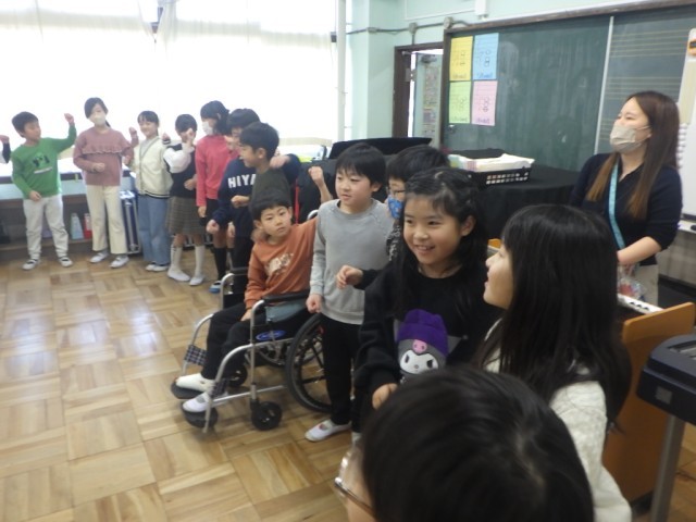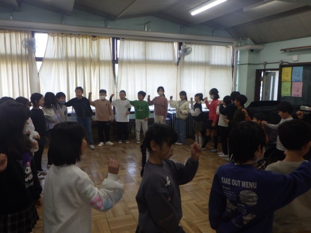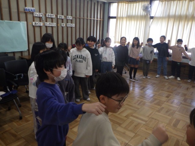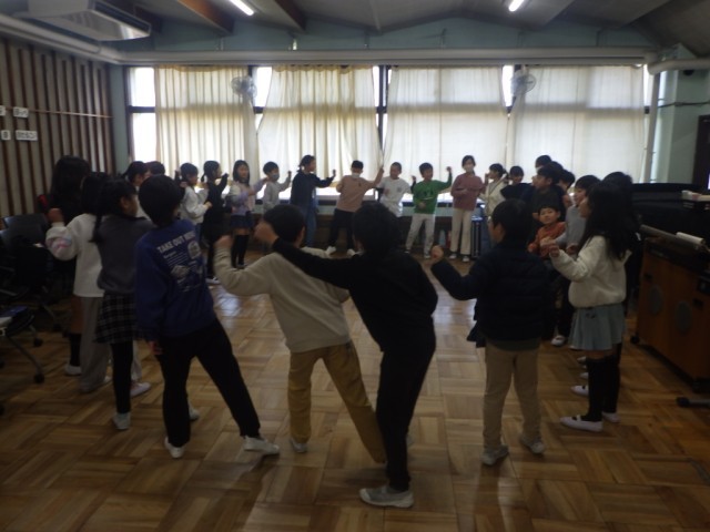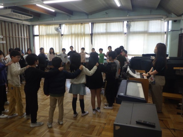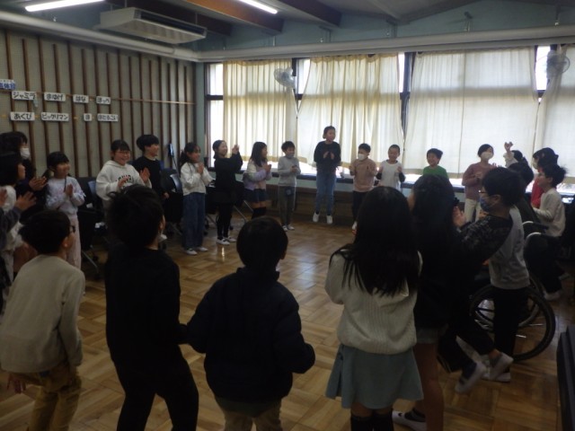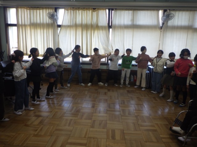 音楽のリズムに合わせて、体を動かしました。学級全員で輪になって、気持ちを合わせて、動きました。音楽のテンポが徐々に速くなっていきます。