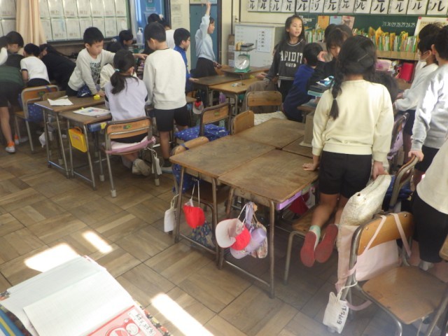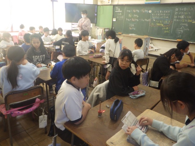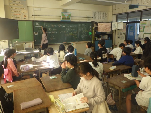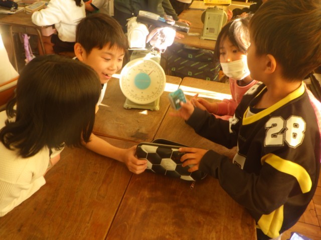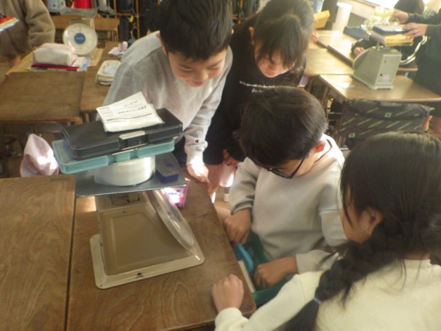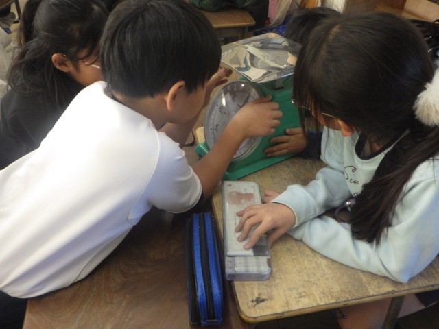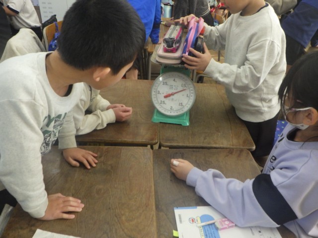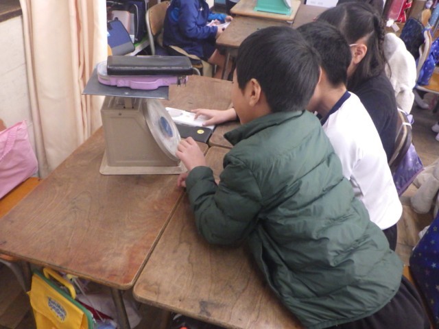 「重さ」の様子です。とても重い物の重さを表すにはどうしたらよいか、学習しました。その後、実際のはかりを使って「1Kg」の重さがどのくらいか実感しました。