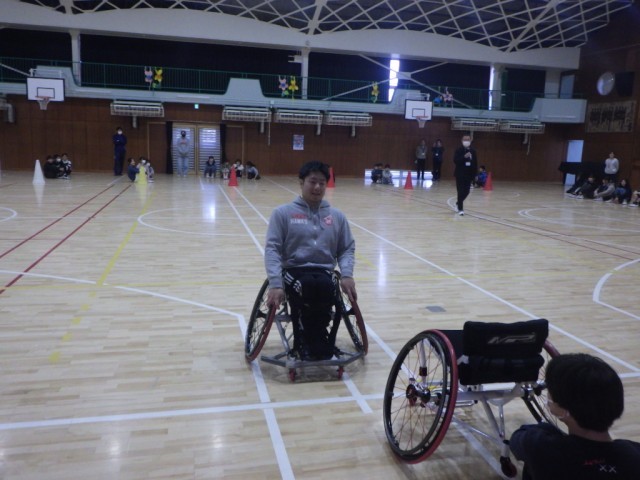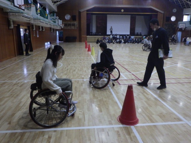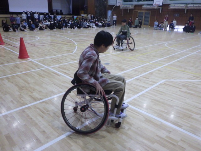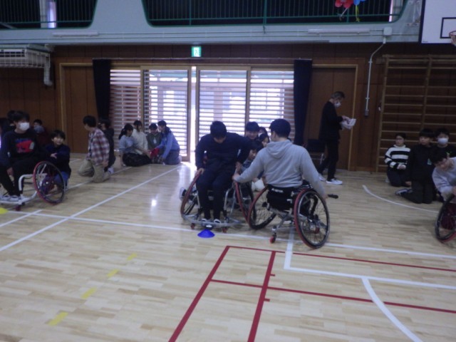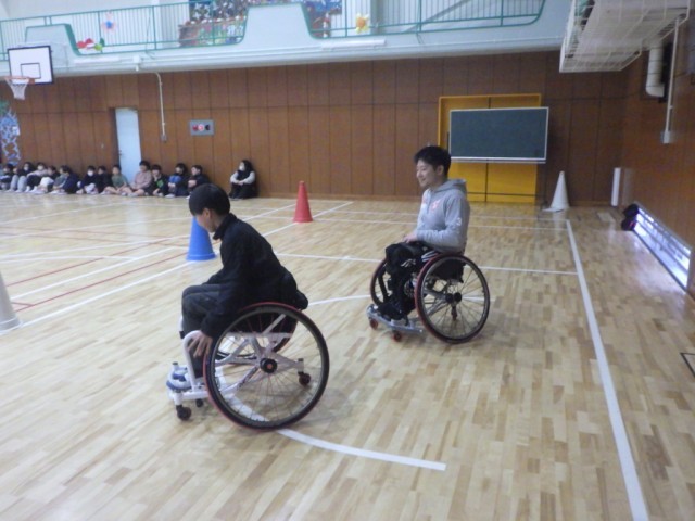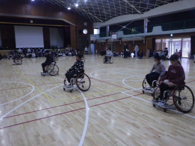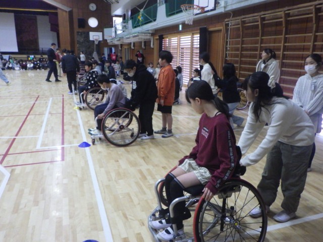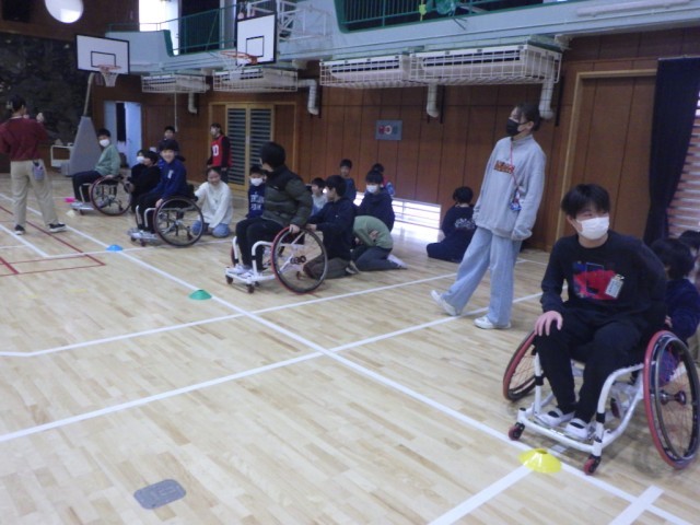 2時間目は、6年生を対象に車椅子バスケットボールで使用する車椅子の乗車体験を行いました。