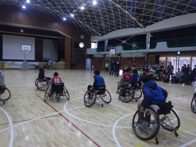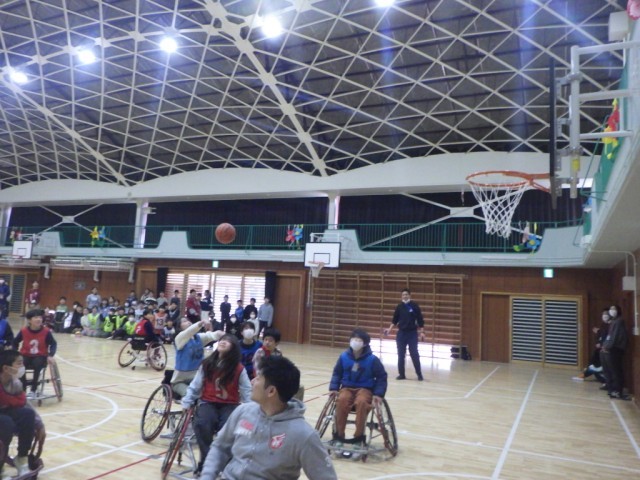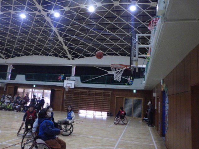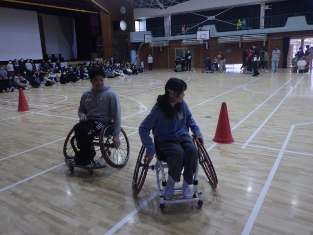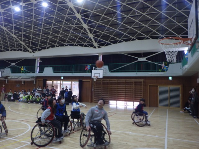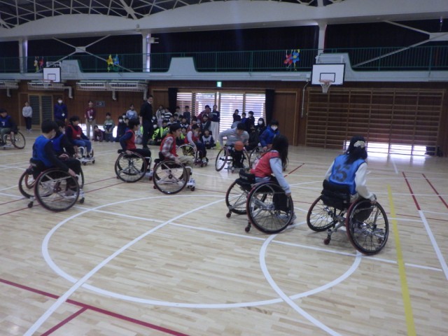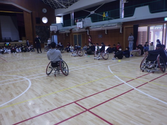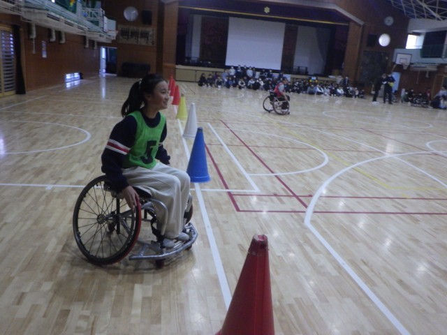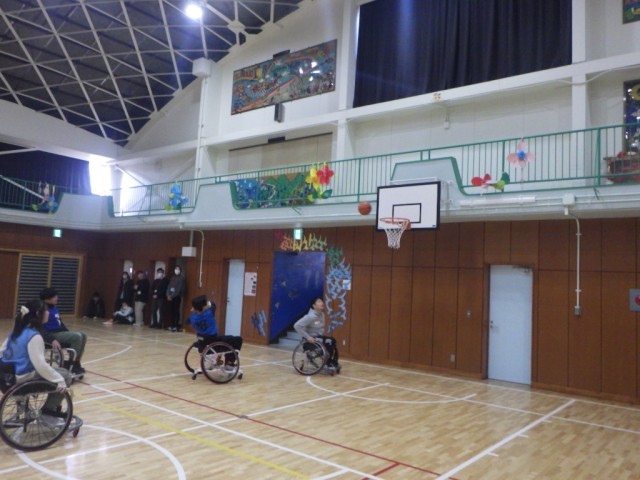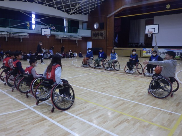 子どもたちは、実施に車椅子に乗車し、前進、方向転換等の操作を実際に体験しました。その後、車椅子バスケットボールのミニゲームを川原氏を交えて行いました。