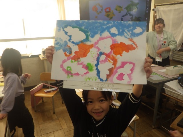 紙だけでなく、手のひらにも色をつけて、作品を彩りました。