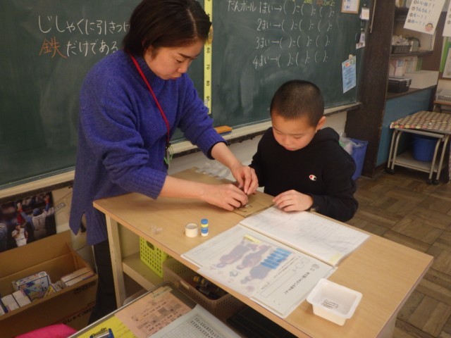 「磁石の不思議」の様子です。磁石と鉄の距離が長くなると、鉄を引きつける力はどうなるのだろうか、友だちと一緒に確認していきました。