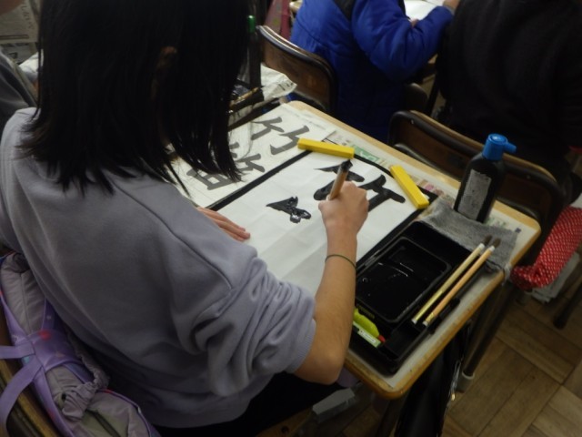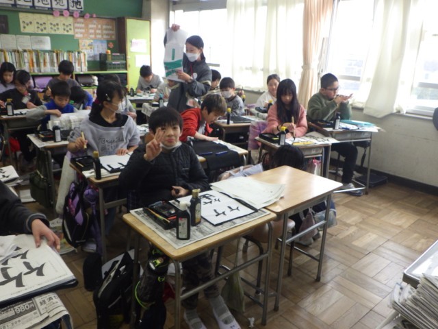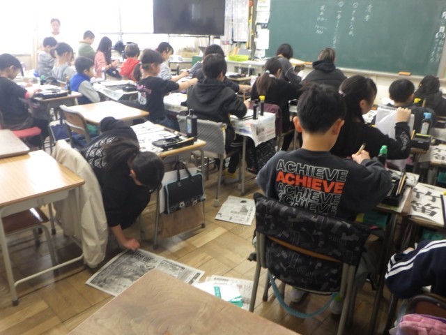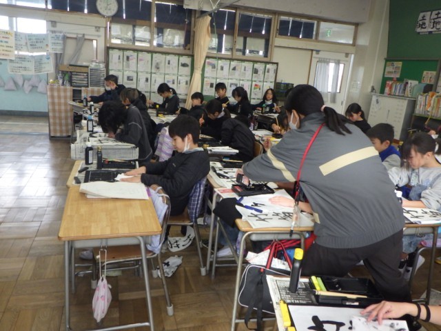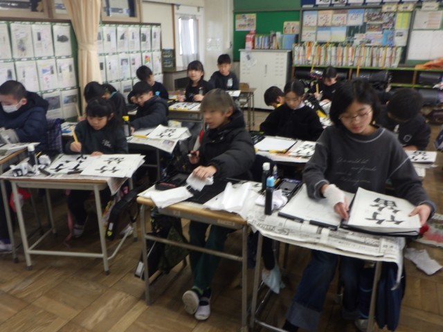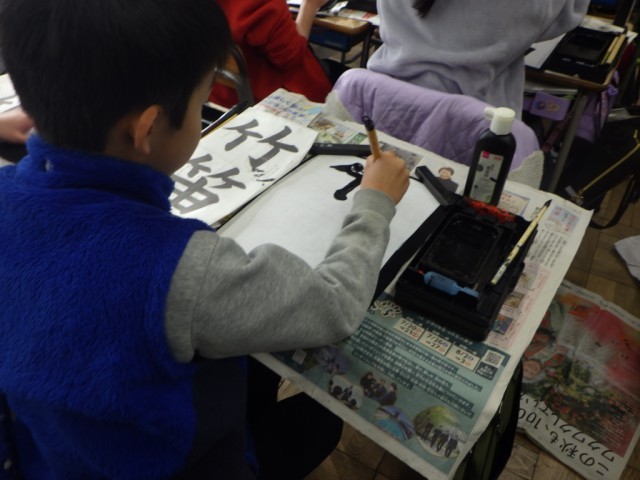 「文字の組み立て方(上下)」の様子です。半紙に向かい、一心に筆を動かす姿が見られました。※21日の様子です。