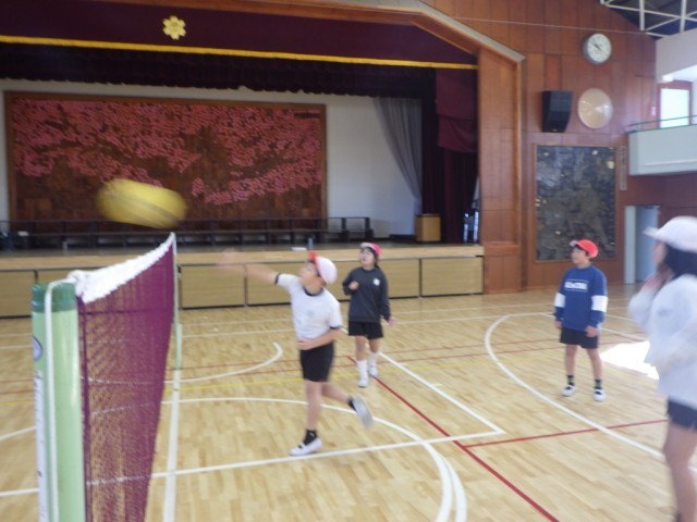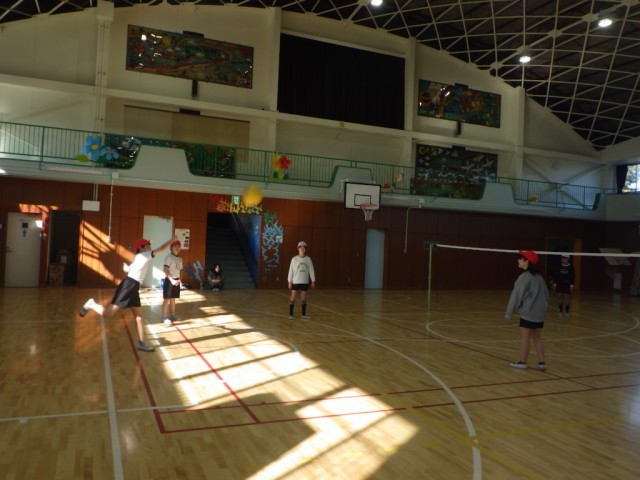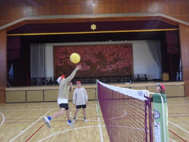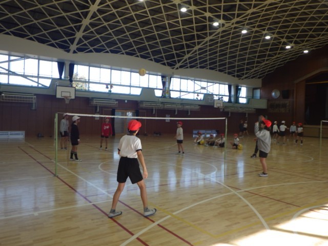 「キャッチバレーボール」の様子です。相手コートにサーブを打ち、それを受け取り(キャッチし)、見方にパスし、パスを受けた人が、トスとしてアタッカーが打ちやすいようにボールを投げ上げます。それを、アタッカーが相手コートに打つというルールで行われていました。