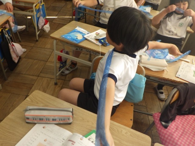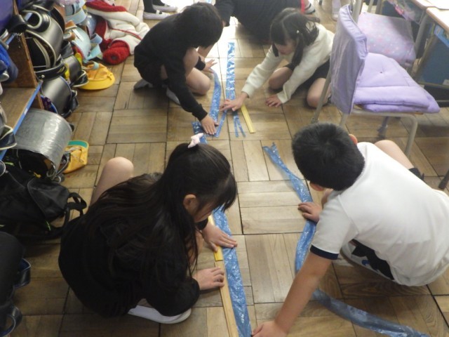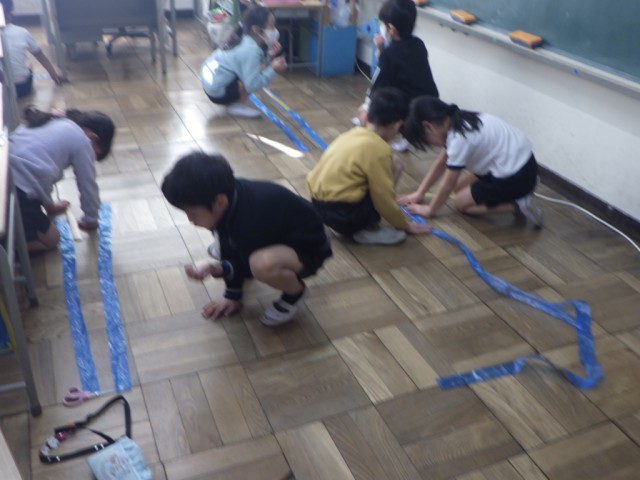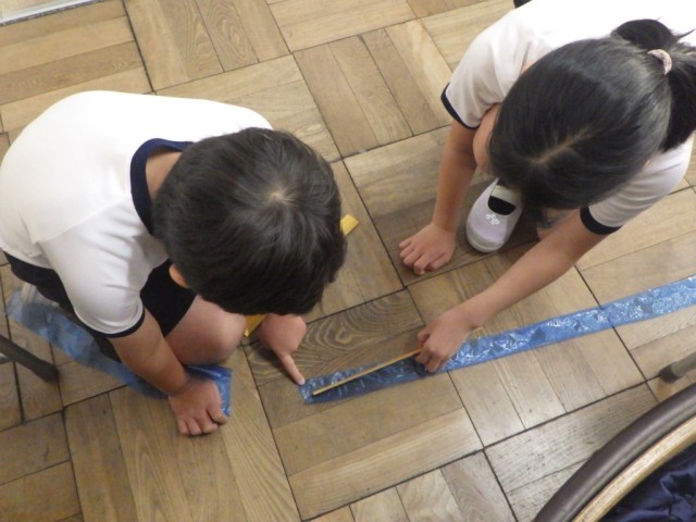「長さ」の様子です。両手を広げた長さはどのくらいか?両手を広げた長さを、スズランテープに写し取って、ものさしで測りました。