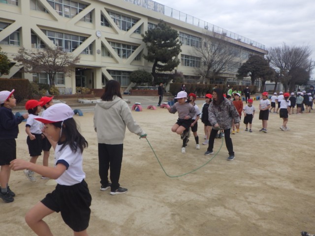 28日(水)昼休みに「長縄記録会 1・2年生の部」が行われました。前半の様子です。