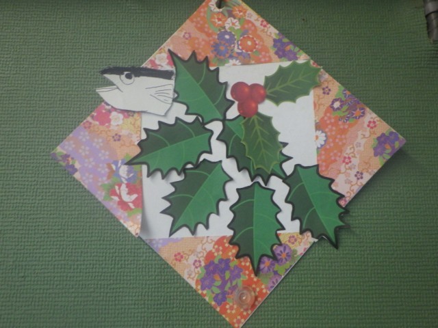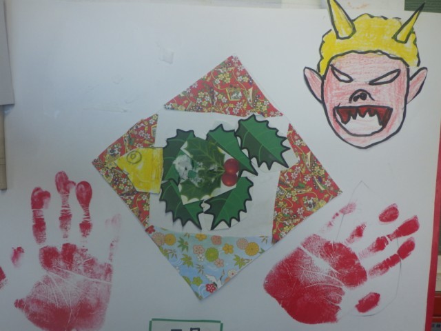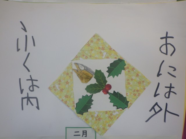 季節の廊下掲示物です。柊(ひいらぎ)と鰯の絵がポイントです。