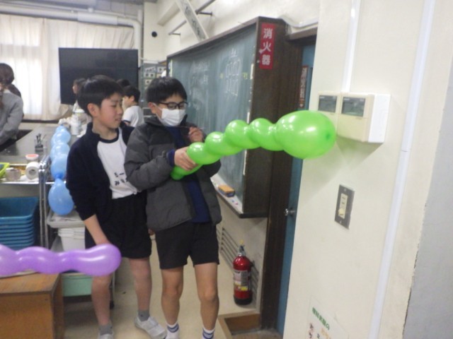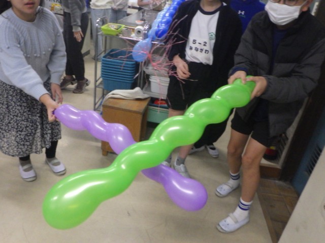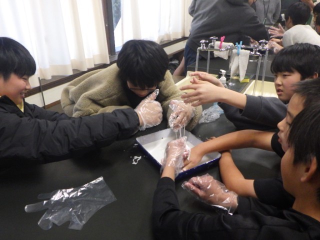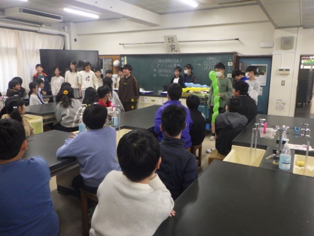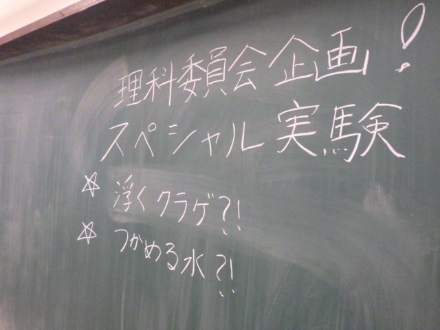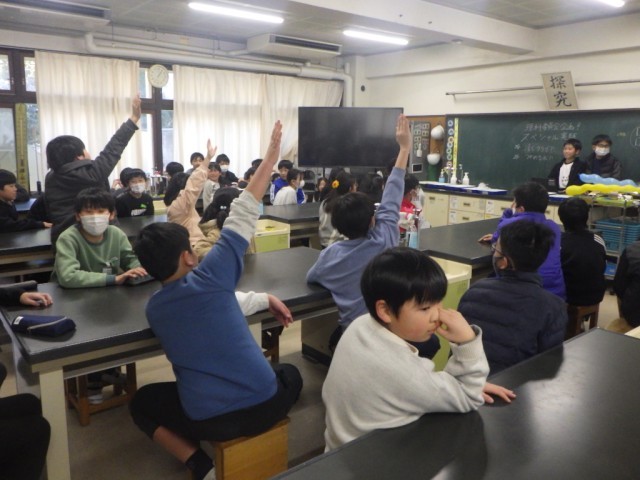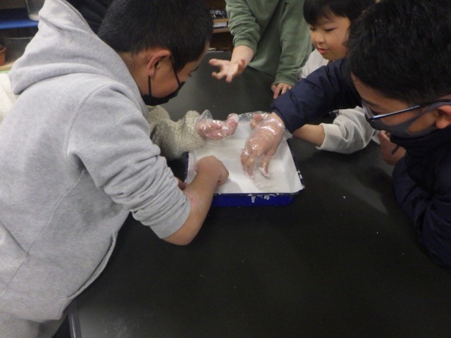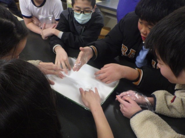 3日(火)ロング昼休みに理科室では、理科委員会企画「スペシャル実験」が行われました。5・6年生の希望者が参加しました。「浮くクラゲ」「つかめる水」の2つの実験が行われました。