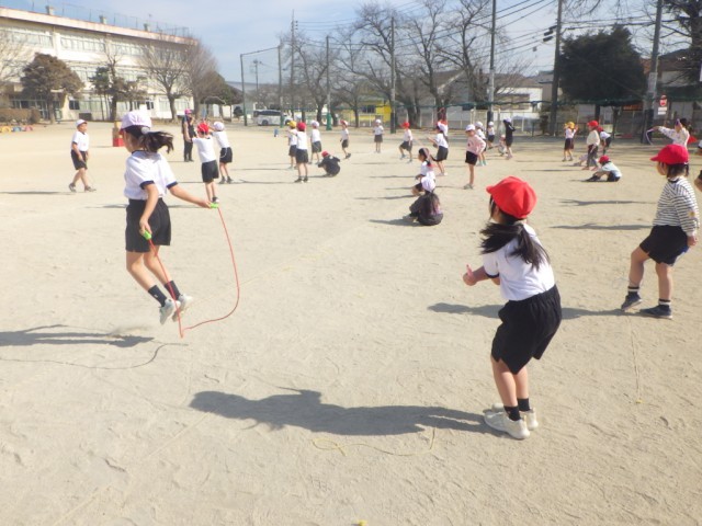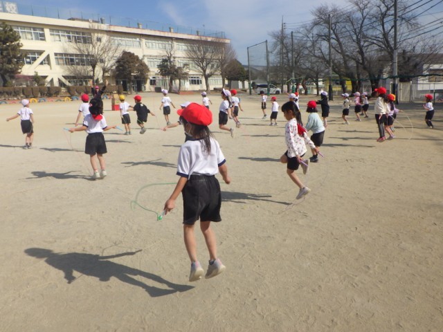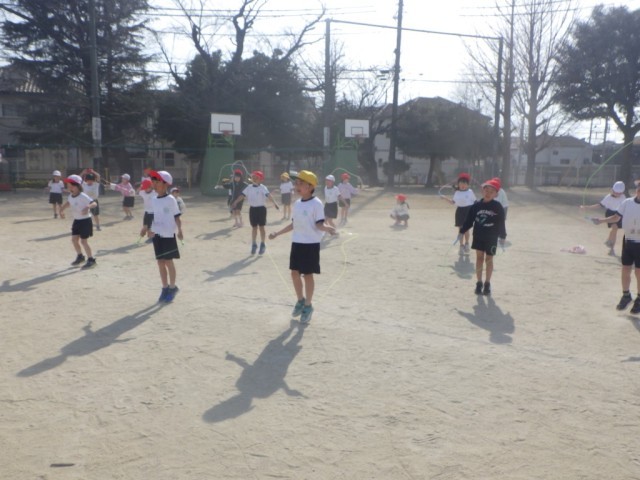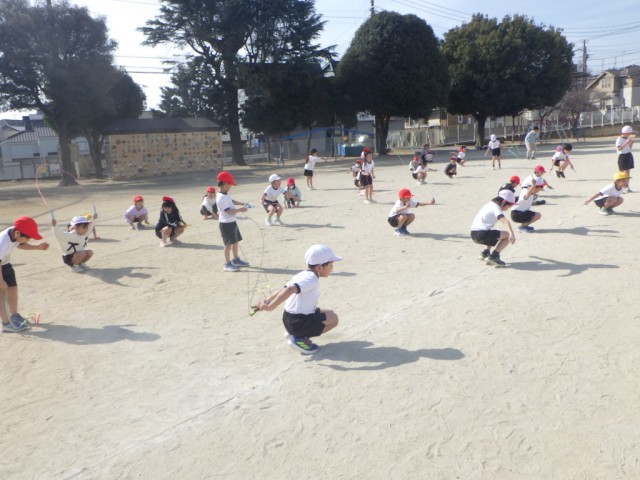 「縄跳びを使った運動遊び」の様子です。前や後ろの連続両足跳びを行うなど、様々な跳び方を楽しみました。