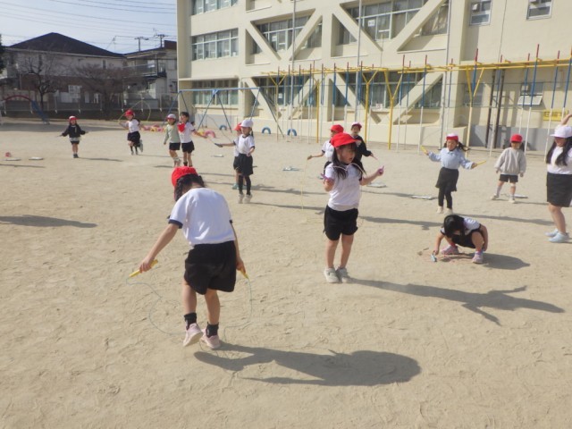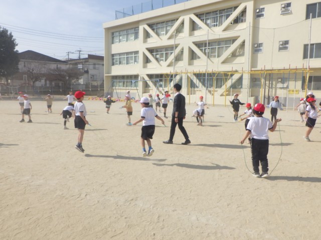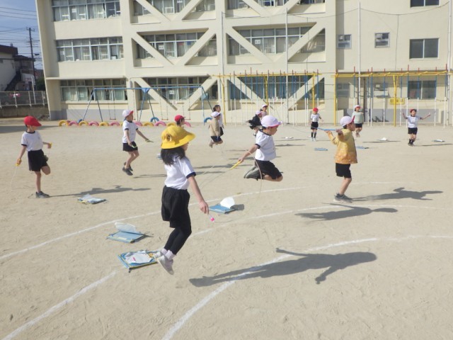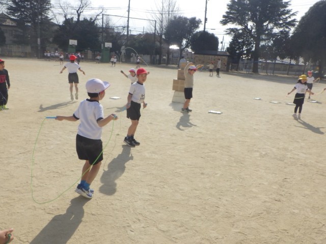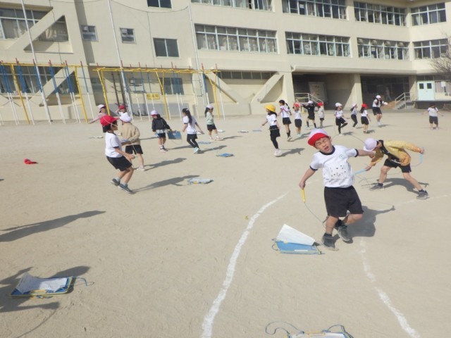 「体育1」とは違うクラスの様子です。こちらでは、決められた時間に何回跳べるか挑戦していました。