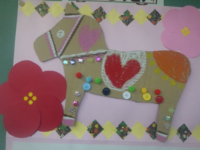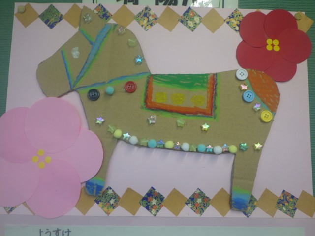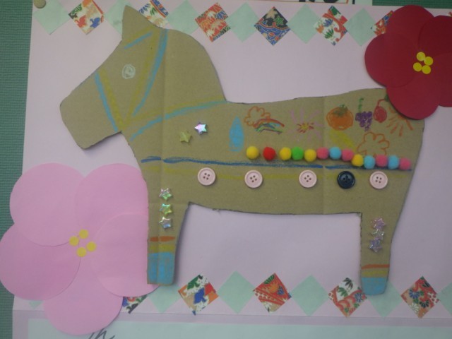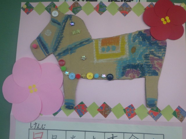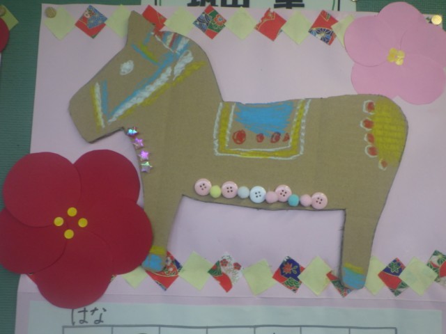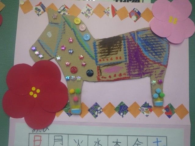 季節の廊下掲示板です。今年の干支がうまく表現されています。