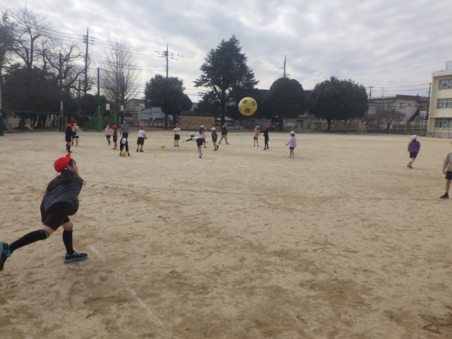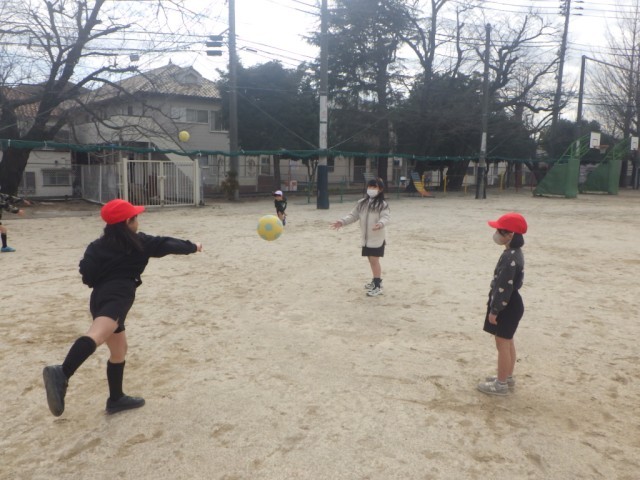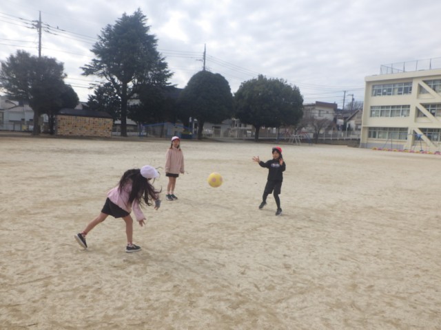 「ボール遊び」の様子です。2~3人組で、ボールを投げ、そのボールを捕る動きを行いました。※12日の様子です。