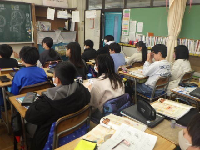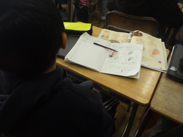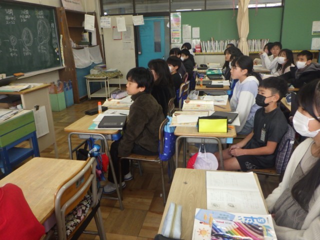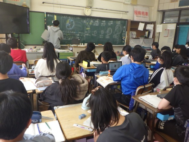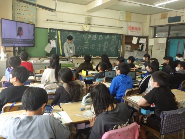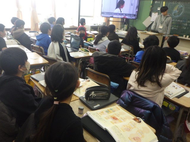 「人のたんじょう」の様子です。胎児に養分が届く仕組みを、大型提示装置に映し出される動画資料を参考に学習しました。