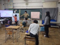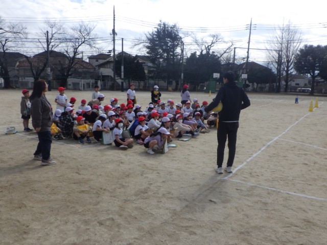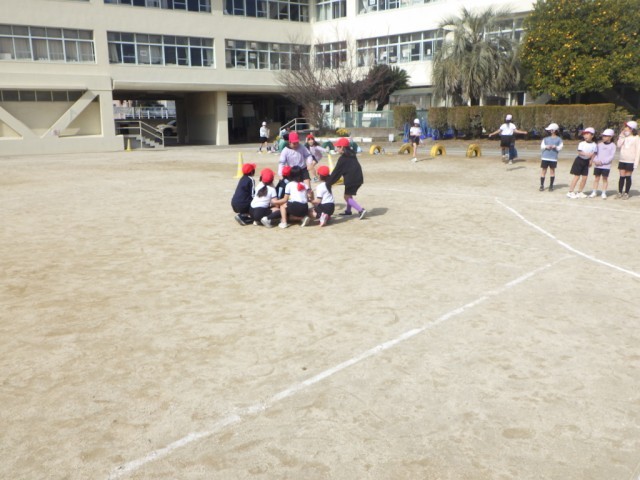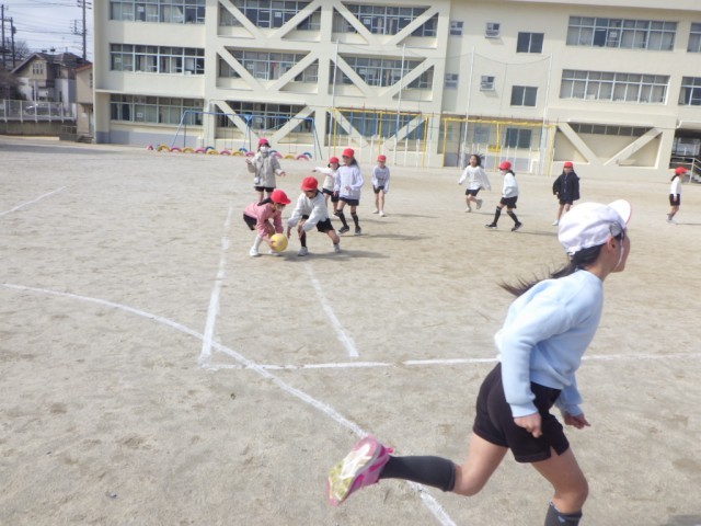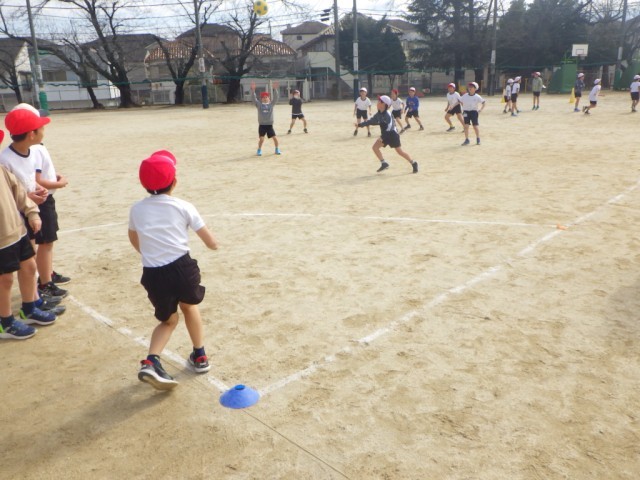 「ベースボール型ゲーム」の様子です。ならびっこゲームとして、ボールを蹴って塁を走って進む攻めと、ボールを捕球してみんなで進塁を防ぐ守りを交代しながら、得点を競い合う楽しさを味わいました。