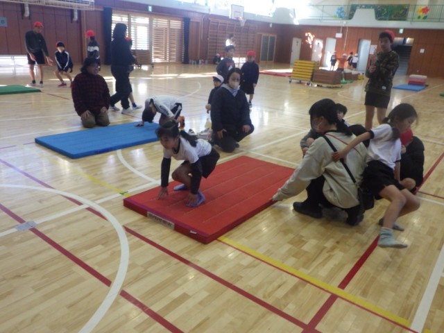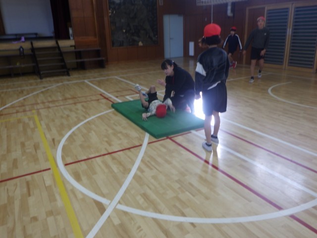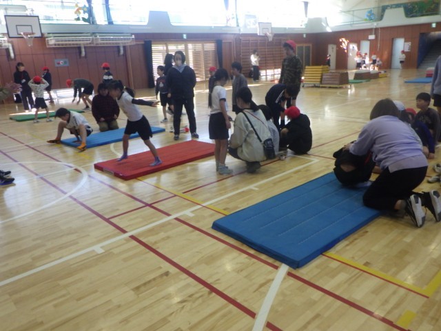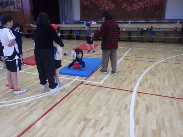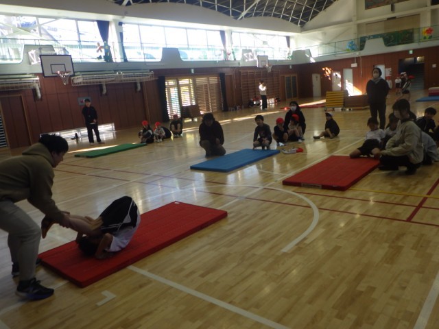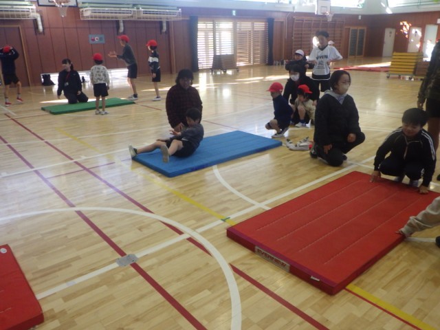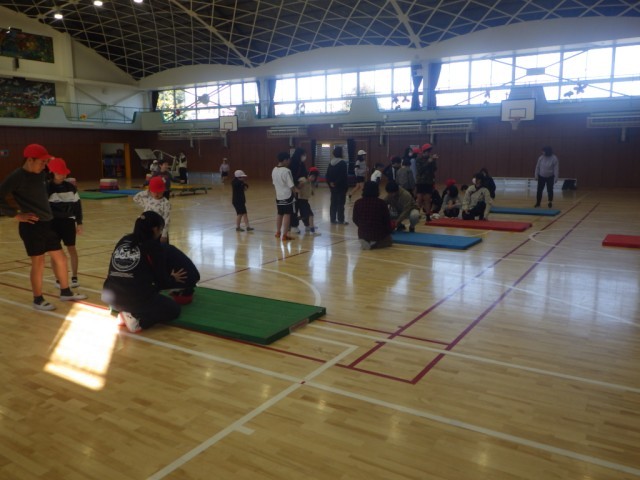 体育館での体育の様子です。マットを使った運動遊びやマットを使った運動に親しみました。前転や、後転、開脚前転に挑戦しました。
