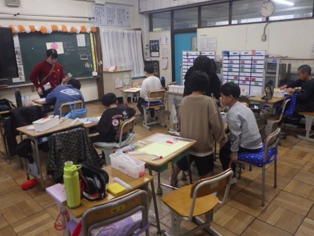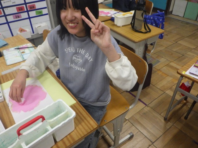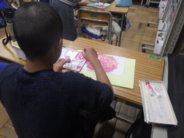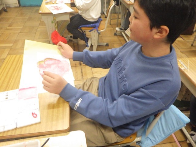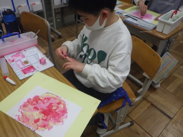 ピンクの絵の具を使って、白い画用紙にスタンプのように色をのせています。はたして、何が出来上がるのでしょうか?※25日の様子です。