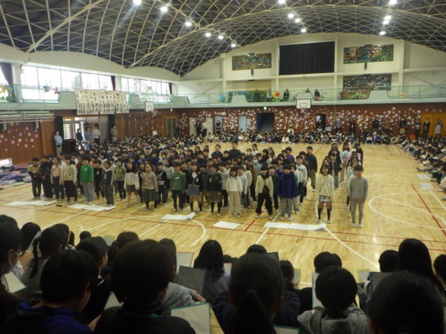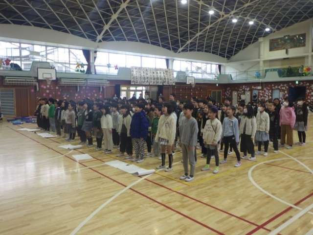 「2年生の発表」の様子です。2年生から6年生へ、鎌小に関するクイズの挑戦状が出されました。その後、♪みんながみんな英雄♪の合唱で、6年生に勇気と力を贈りました。