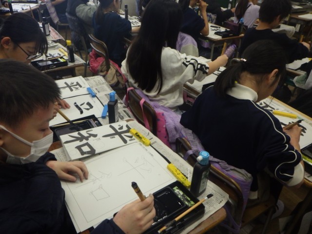 文字の中心と組み立て方に気をつけて、「平和」をていねいに書いている様子です。