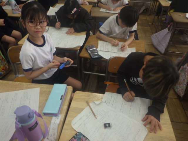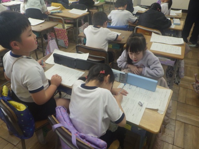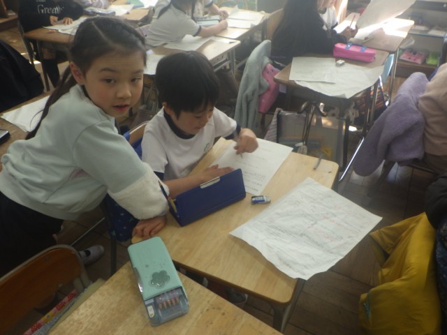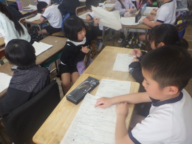「初めて知った学校のこと」の様子です。話す人を決めてインタビューをします。友だちや先生と相談しながら進めていました。