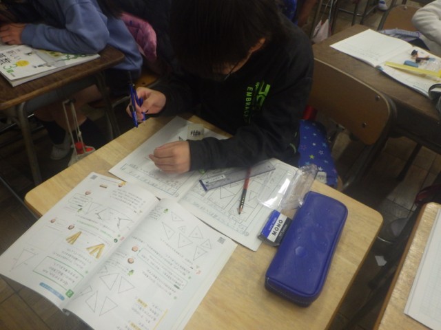 「三角形を調べよう」の様子です。コンパスや定規を使って、二等辺三角形や正三角形の作図を行いました。