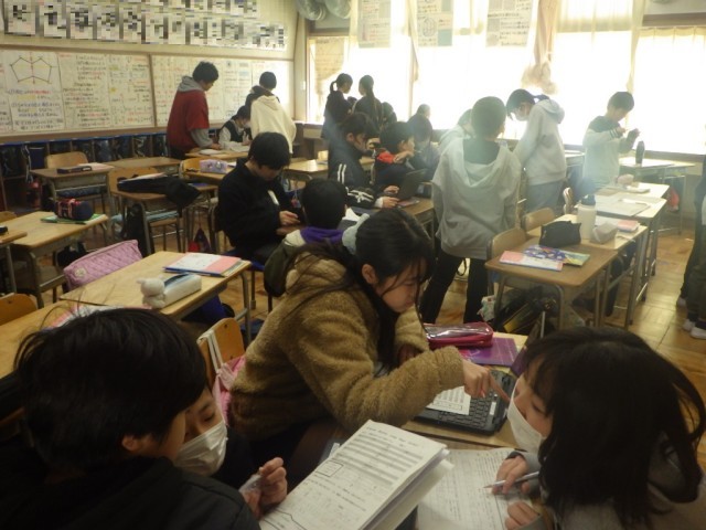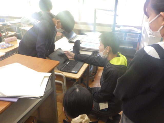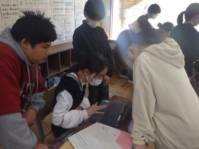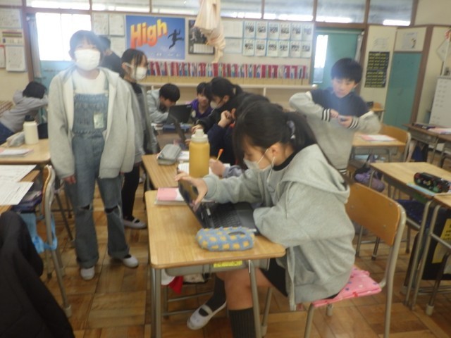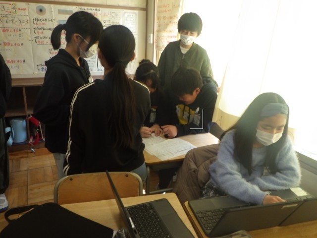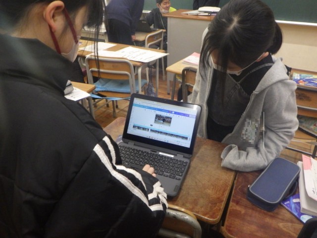「リズム縄跳びコンテスト」に向けて、グループ毎に内容を検討している様子です。3種類の技をつなげる演技構成で、動画を参考に考えています。