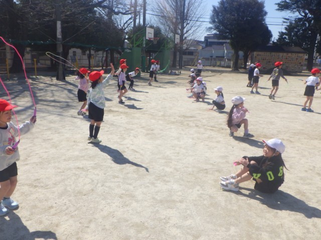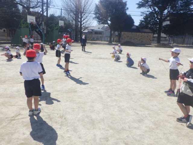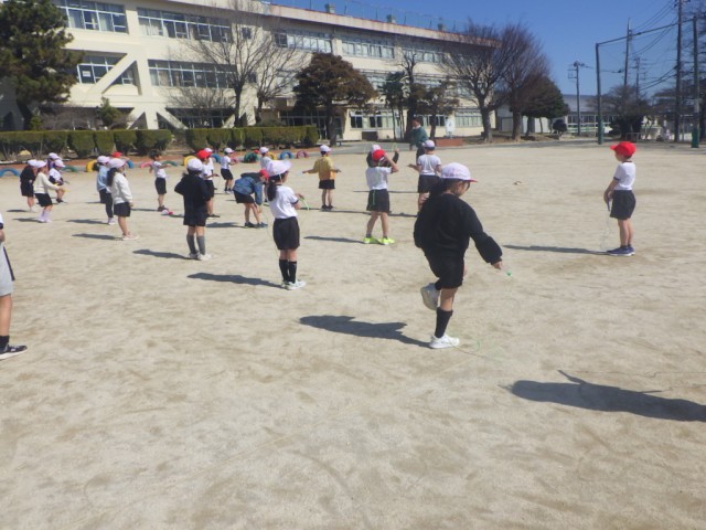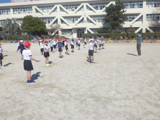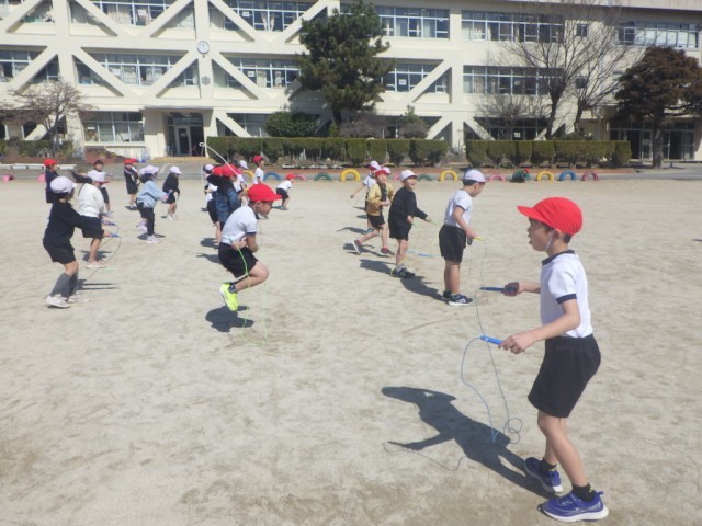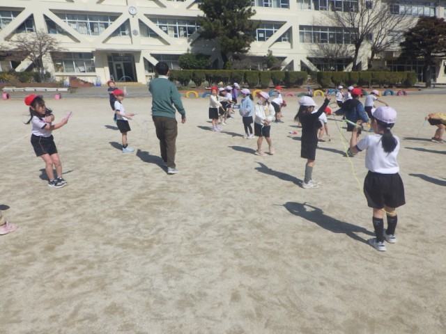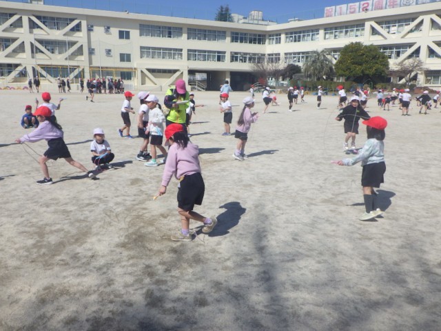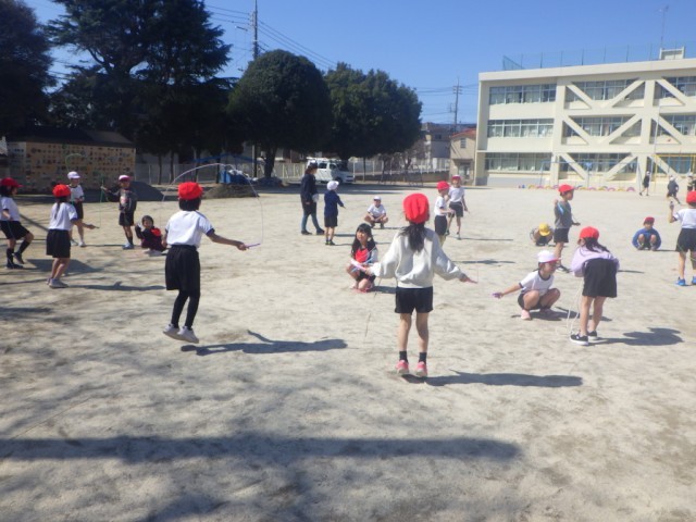 あたたかい陽差しのもと、校庭では「なわ遊び」が行われていました。縄跳びの技に挑戦しました。※5日の様子です。